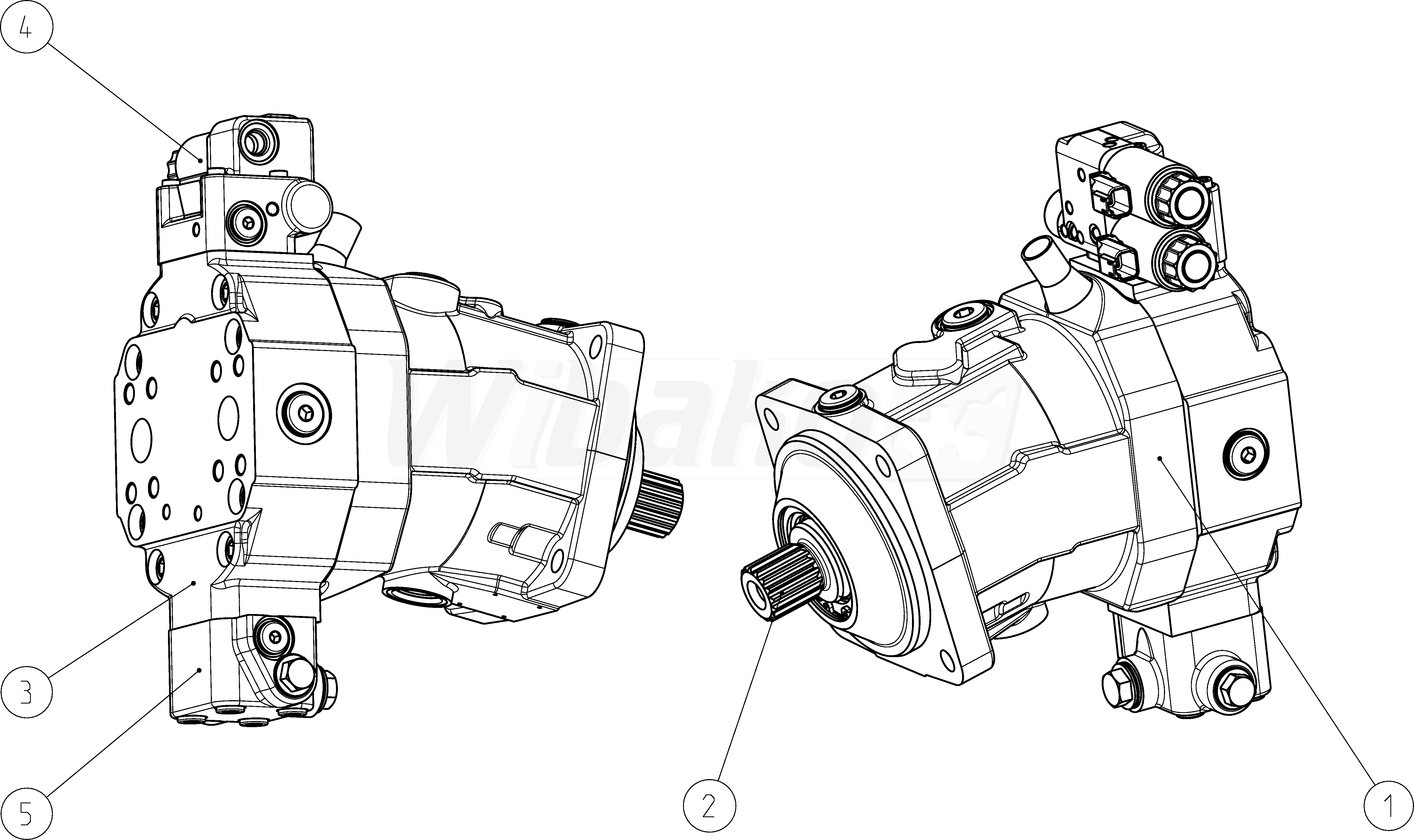 Axial piston variable motor A6VM Series 65. Geometric displacement 080 cm3. Control device: automatic control, speed related, electric travel direction valve + electric Vg max circuit, U = 12 V. Without pressure control/override. Connector for solenoids: DEUTSCH - molded connector, 2-pin, without suppressor diode. Without additional function. Damping one-sided in outlet from large stroking chamber. Setting range for displacement: Without Vg max setting screw, long (0-adjustable) Vg min setting screw. Metric, port threads with O-ring sealing according to ISO 6149. Sealing material: FKM (fluoroelastomer). Standard shaft bearing. Mounting flange ISO 3019-2 140-4. Splined shaft W35×2×16×9g. SAE working ports A and B at rear. With flushing and boost pressure valve, mounted flushing on both sides, flushing flow at: Δp = pND ‒ pG = 25 bar and v = 10 mm2/s (pND = low pressure, pG = case pressure). Flushing flow: 8. Without speed sensor. Standard version .