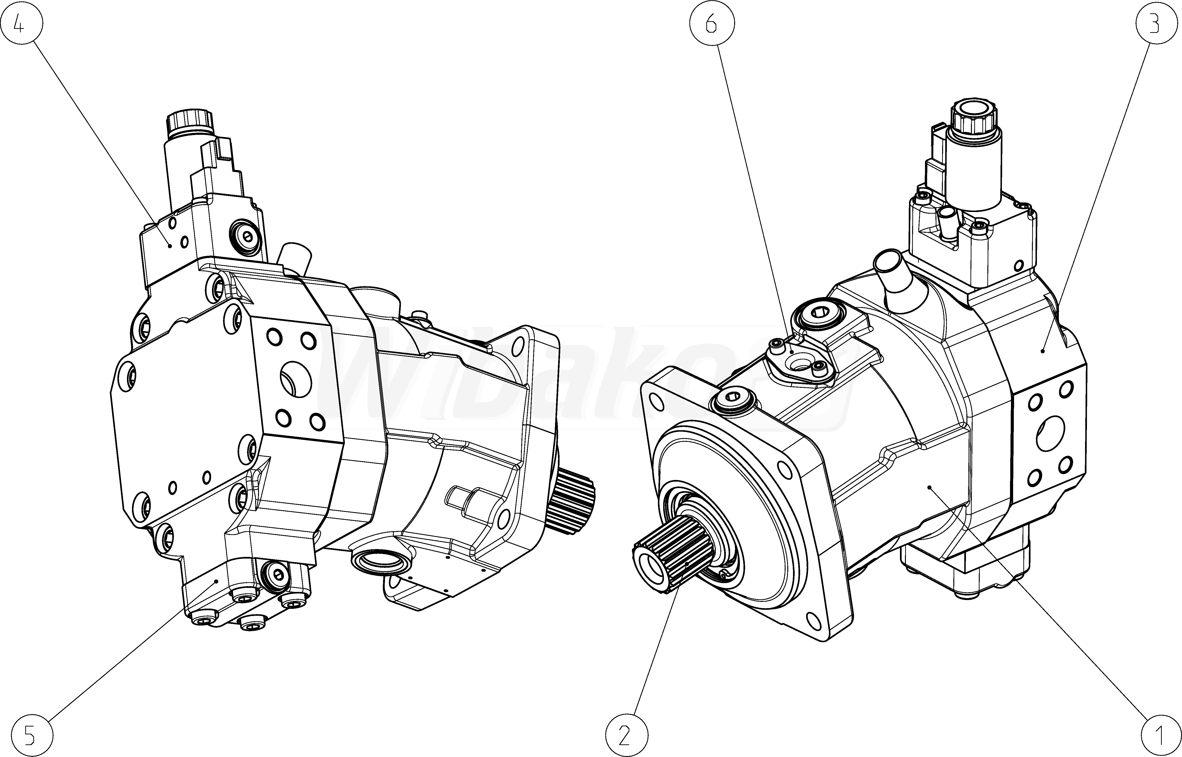 Axial piston variable motor A6VM Series 65. Geometric displacement 080 cm3. Control device: proportional control, electrical, negative control, U = 24 V. Without pressure control/override. Connector for solenoids: DEUTSCH - molded connector, 2-pin, without suppressor diode. Without additional function. Without damping. Setting range for displacement: Without Vg max setting screw, extra long Vg min setting screw. Metric, port threads with O-ring sealing according to ISO 6149. Sealing material: FKM (fluoroelastomer). Standard shaft bearing. Mounting flange ISO 3019-2 140-4. Splined shaft W40×2×18×9g. SAE working ports A and B at side, opposite. Without valve. Standard version .