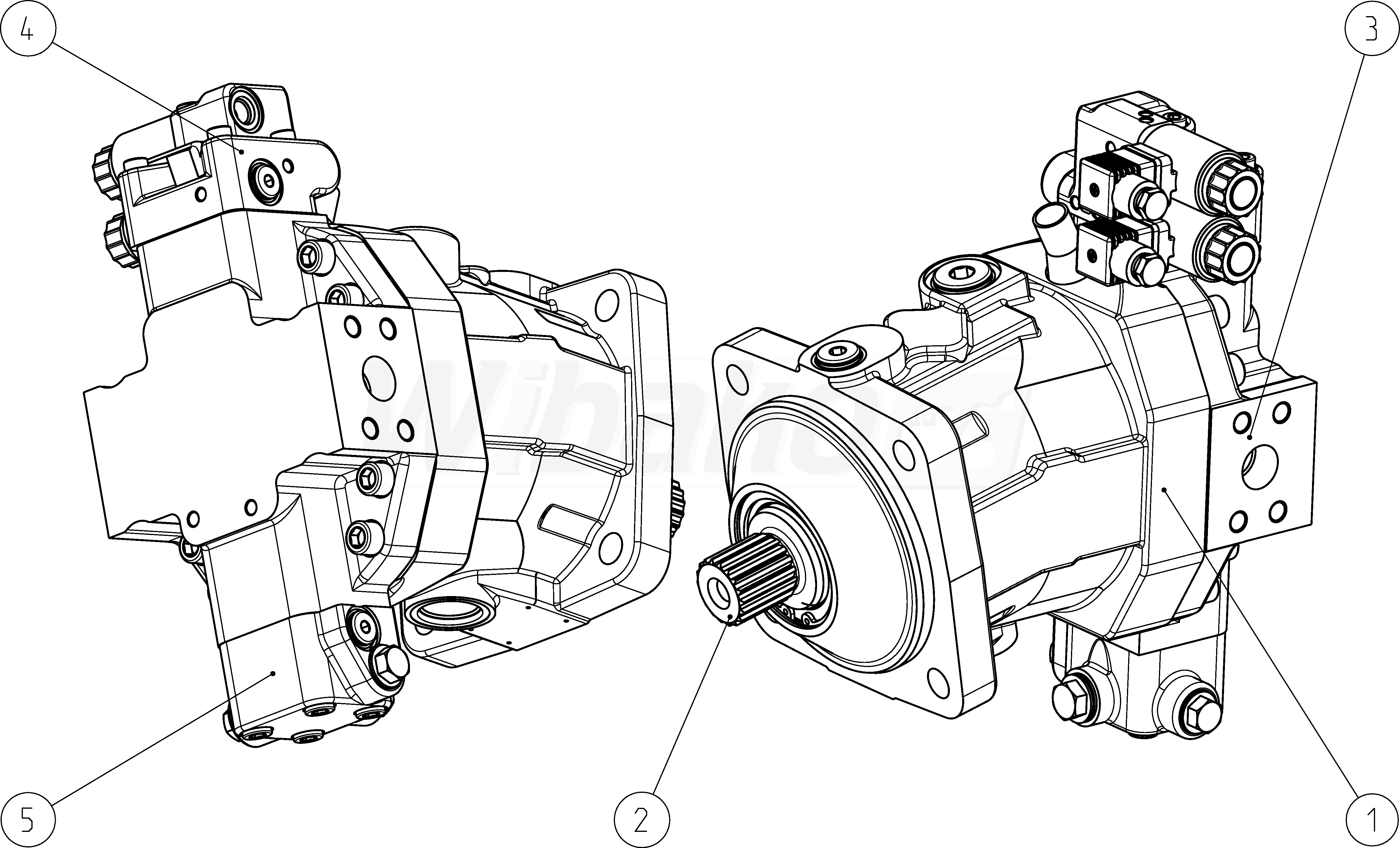 Axial piston variable motor A6VM Series 65. Geometric displacement 107 cm3. Control device: automatic control, speed related, electric travel direction valve + electric Vg max circuit, U = 12 V. Without pressure control/override. Setting range for displacement: Short Vg max setting screw, extra long Vg min setting screw. Metric, port threads with O-ring sealing according to ISO 6149. Sealing material: FKM (fluoroelastomer). Standard shaft bearing. Mounting flange ISO 3019-2 160-4. Splined shaft W40×2×18×9g. SAE working ports A and B at side, opposite. With flushing and boost pressure valve, mounted flushing on both sides, flushing flow at: Δp = pND ‒ pG = 25 bar and v = 10 mm2/s (pND = low pressure, pG = case pressure). Flushing flow: 10. Without speed sensor. Standard version .