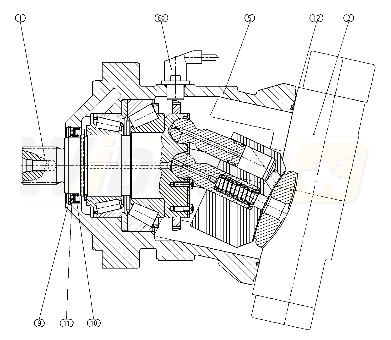 Axial piston variable motor A6VM Series 63. Geometric displacement 107 cm3. Control device: proportional control, electric, U = 12 V. Sealing material: FKM (fluoroelastomer). Splined shaft DIN 5480. Mounting flange ISO 3019-2, Without speed sensor.