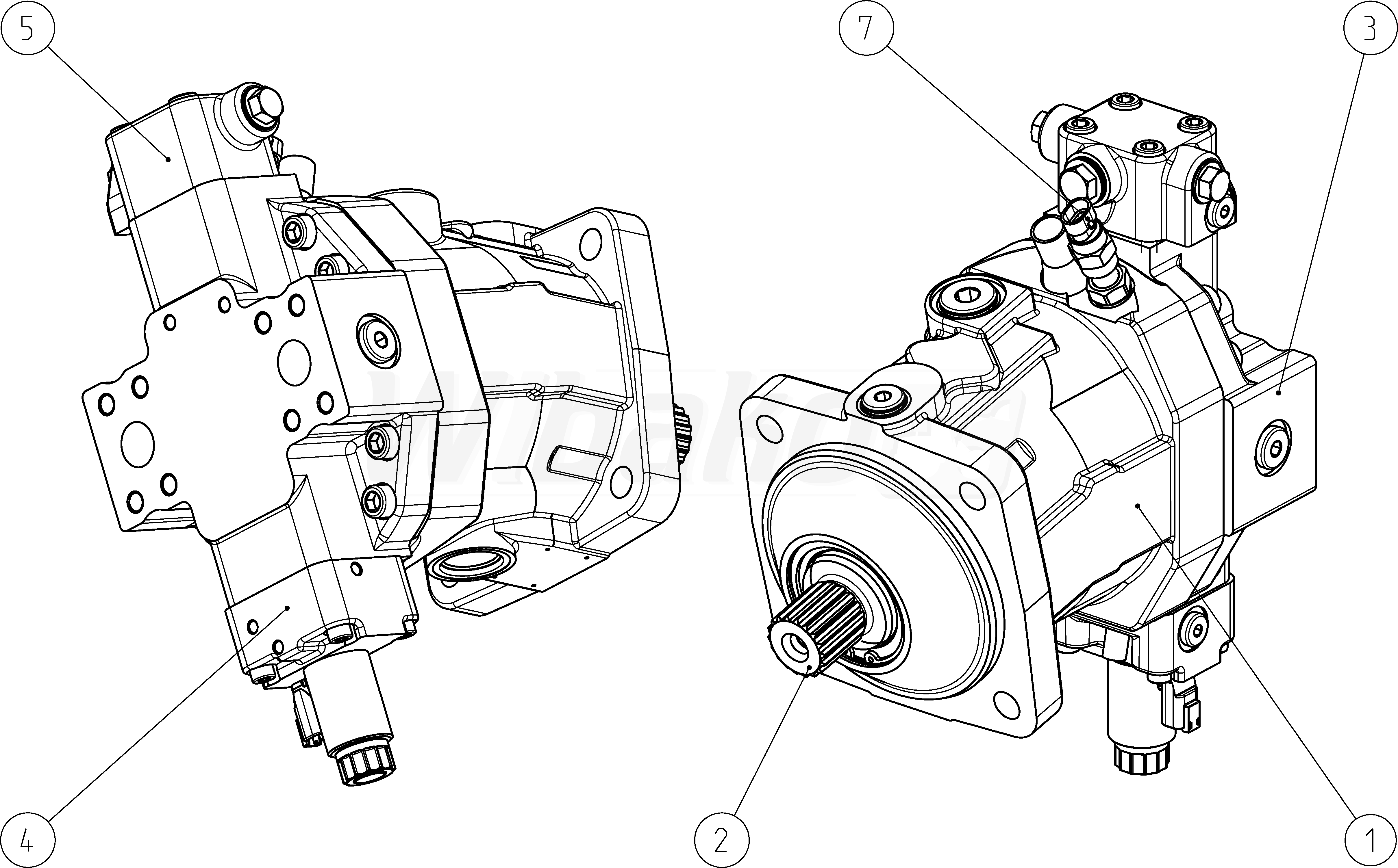 Axial piston variable motor A6VM Series 63. Geometric displacement 107 cm3. Control device: proportional control, electric, U = 12 V. Sealing material: FKM (fluoroelastomer). Splined shaft DIN 5480. Mounting flange ISO 3019-2, 4-hole. Port plate for working line: SAE working ports A and B at rear, flushing and boost-pressure valve, mounted. Without speed sensor. DEUTSCH molded connector, 2-pin – without suppressor diode. Beginning of control at Vg min. Special version.