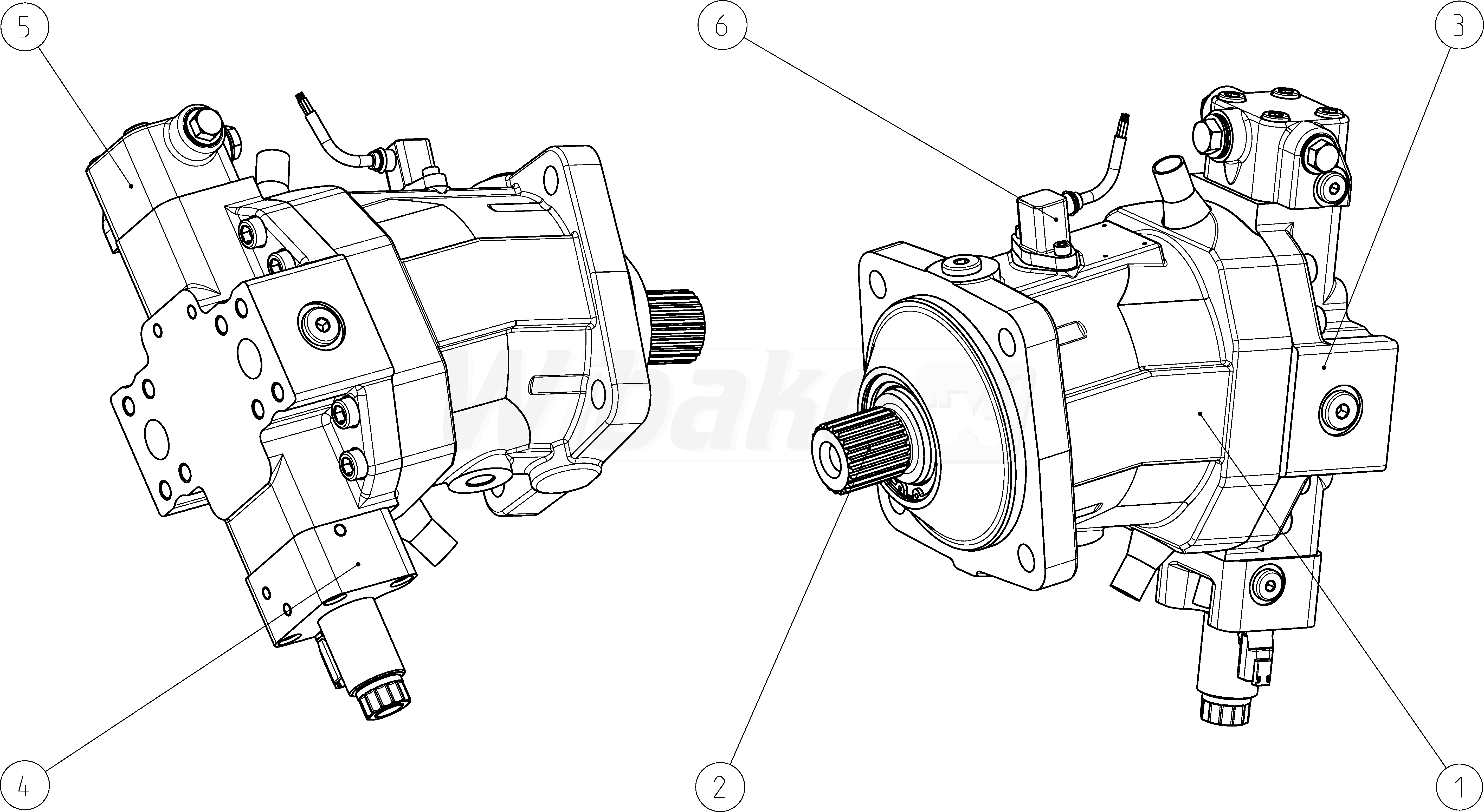 Axial piston variable motor A6VM Series 63. Geometric displacement 107 cm3. Control device: proportional control, electric, U = 24 V. Sealing material: FKM (fluoroelastomer). Splined shaft DIN 5480. Mounting flange ISO 3019-2, 4-hole. Port plate for working line: SAE working ports A and B at rear, flushing and boost-pressure valve, mounted. HDD speed sensor mounted. DEUTSCH molded connector, 2-pin – without suppressor diode. Beginning of control at Vg min.