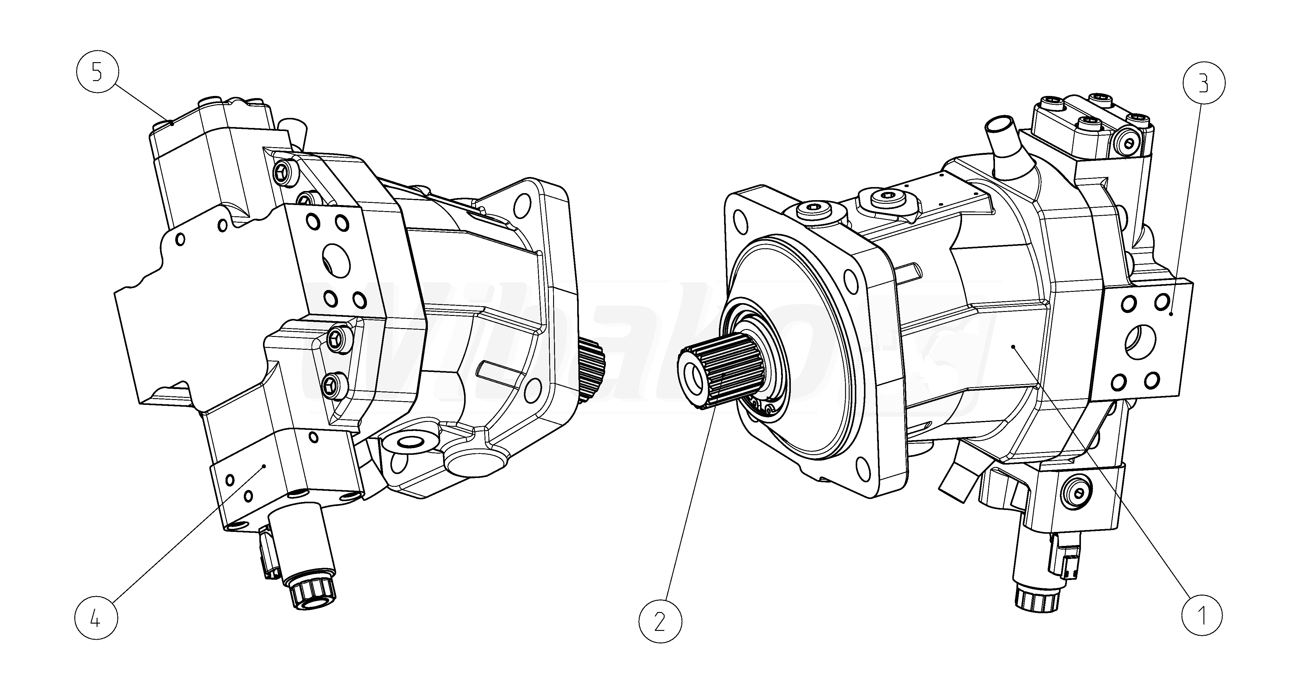 Axial piston variable motor A6VM Series 63. Geometric displacement 107 cm3. Control device: proportional control, electric, U = 24 V. Sealing material: FKM (fluoroelastomer). Splined shaft DIN 5480. Mounting flange ISO 3019-2, 4-hole. Port plate for working line: SAE working ports A and B lateral, opposite, without valve. Without speed sensor. DEUTSCH molded connector, 2-pin – without suppressor diode. Beginning of control at Vg min.
