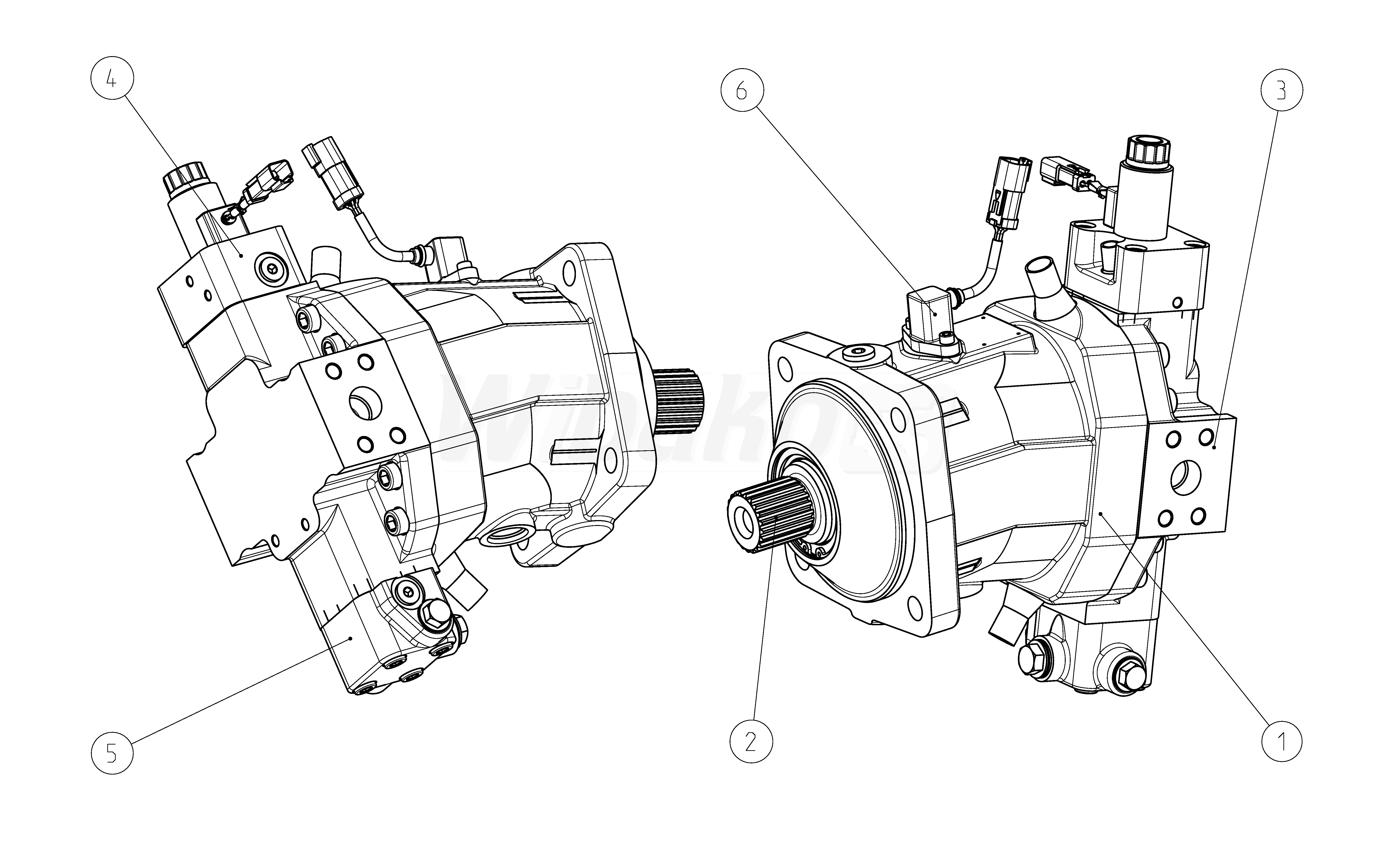 Axial piston variable motor A6VM Series 63. Geometric displacement 107 cm3. Control device: proportional control, electric, U = 24 V. Sealing material: FKM (fluoroelastomer). Splined shaft DIN 5480. Mounting flange ISO 3019-2, 4-hole. Port plate for working line: SAE working ports A and B lateral, opposite, flushing and boost-pressure valve, mounted. HDD speed sensor mounted.