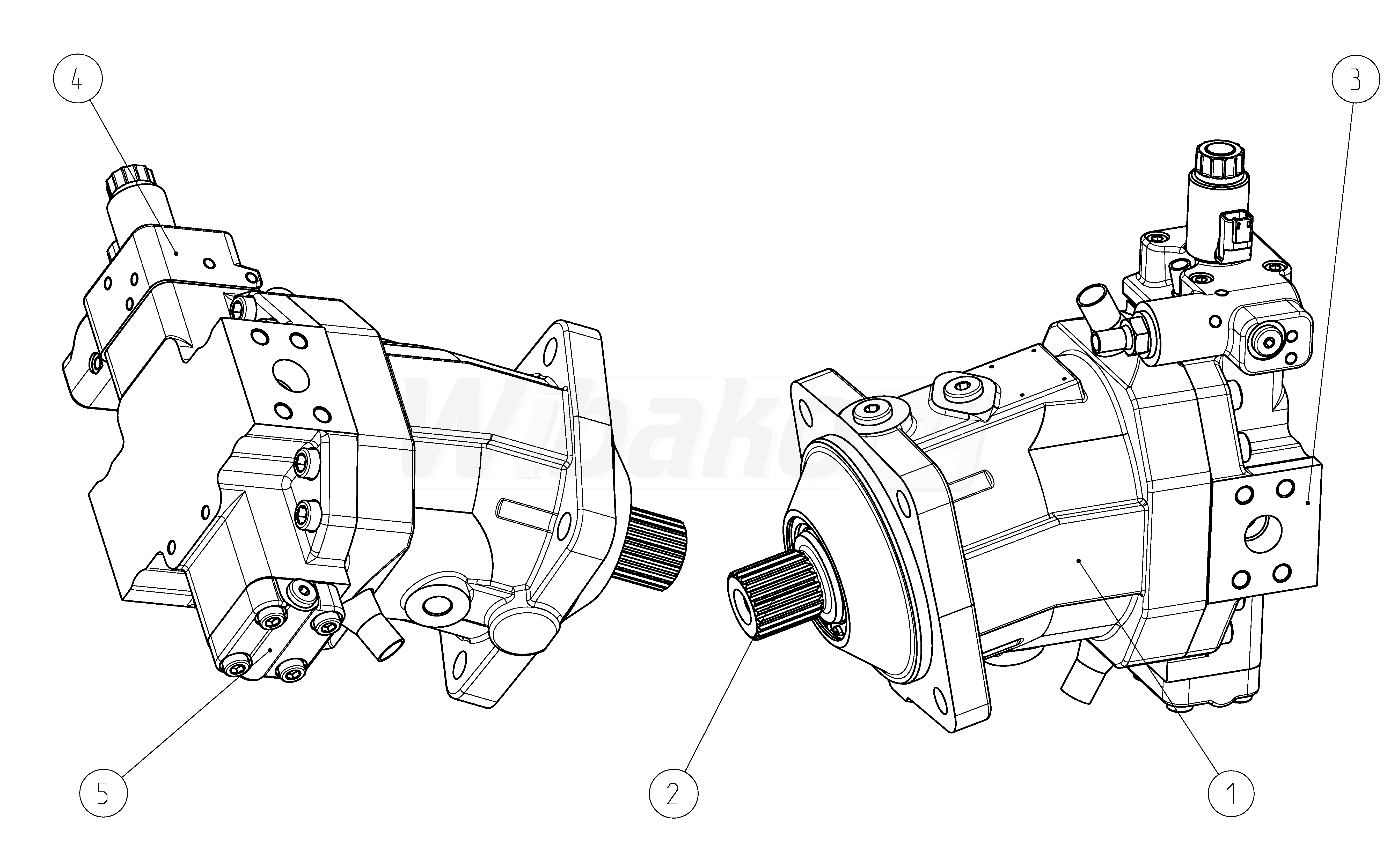 Axial piston variable motor A6VM Series 63. Geometric displacement 107 cm3. Control device: proportional control, electric, U = 24 V. Sealing material: FKM (fluoroelastomer). Splined shaft DIN 5480. Mounting flange ISO 3019-2, 4-hole. Port plate for working line: SAE working ports A and B lateral, opposite, without valve. Without speed sensor. DEUTSCH molded connector, 2-pin – without suppressor diode. Beginning of control at Vg max. Special version.