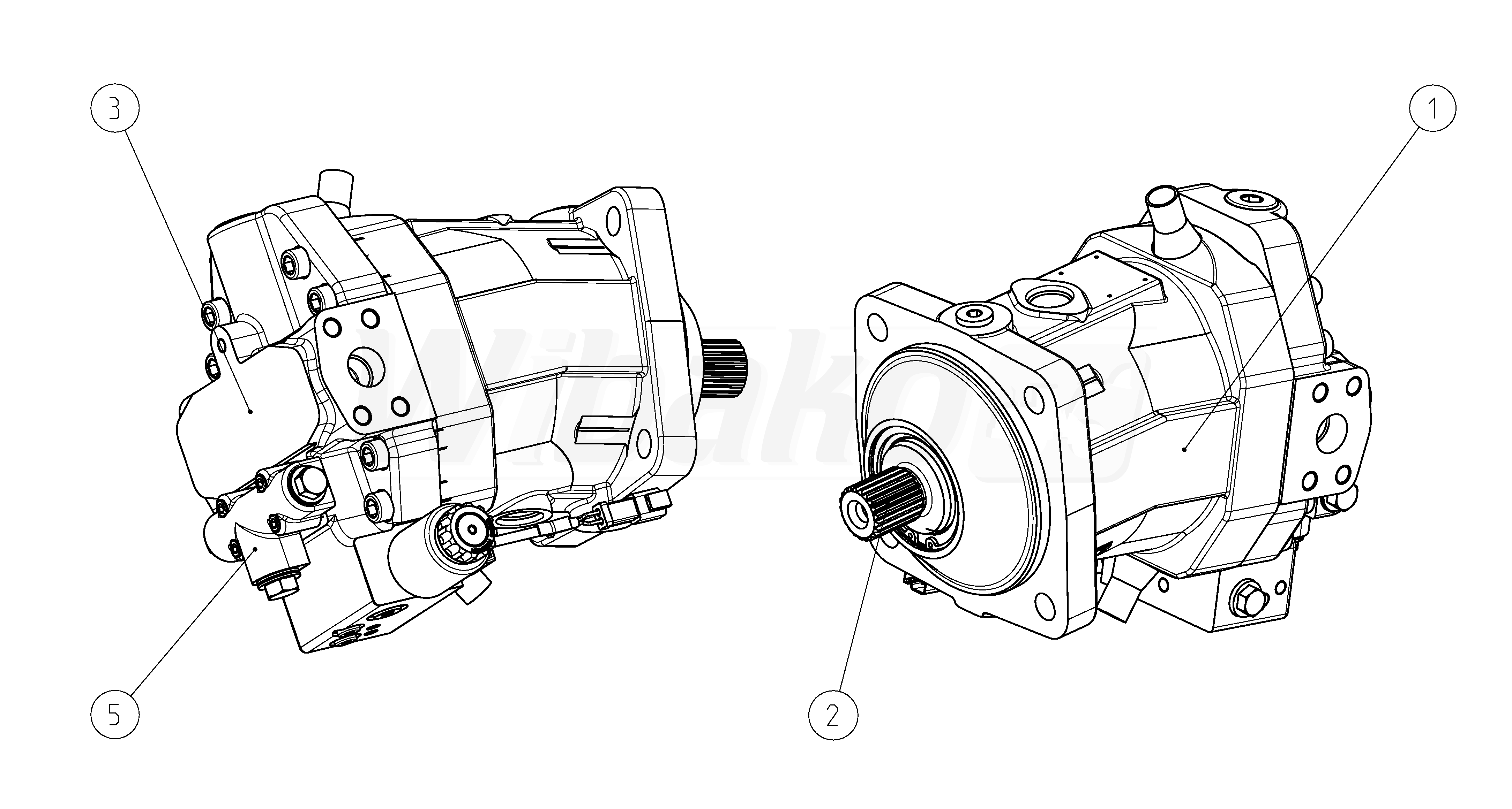 Axial piston variable motor A6VM Series 63. Geometric displacement 107 cm3. Control device: two-point control, electric, U = 12 V. Sealing material: FKM (fluoroelastomer). Mounting flange ISO 3019-2, 4-hole. Port plate for working line: SAE working ports A and B lateral, opposite, flushing and boost-pressure valve, mounted. Without speed sensor.