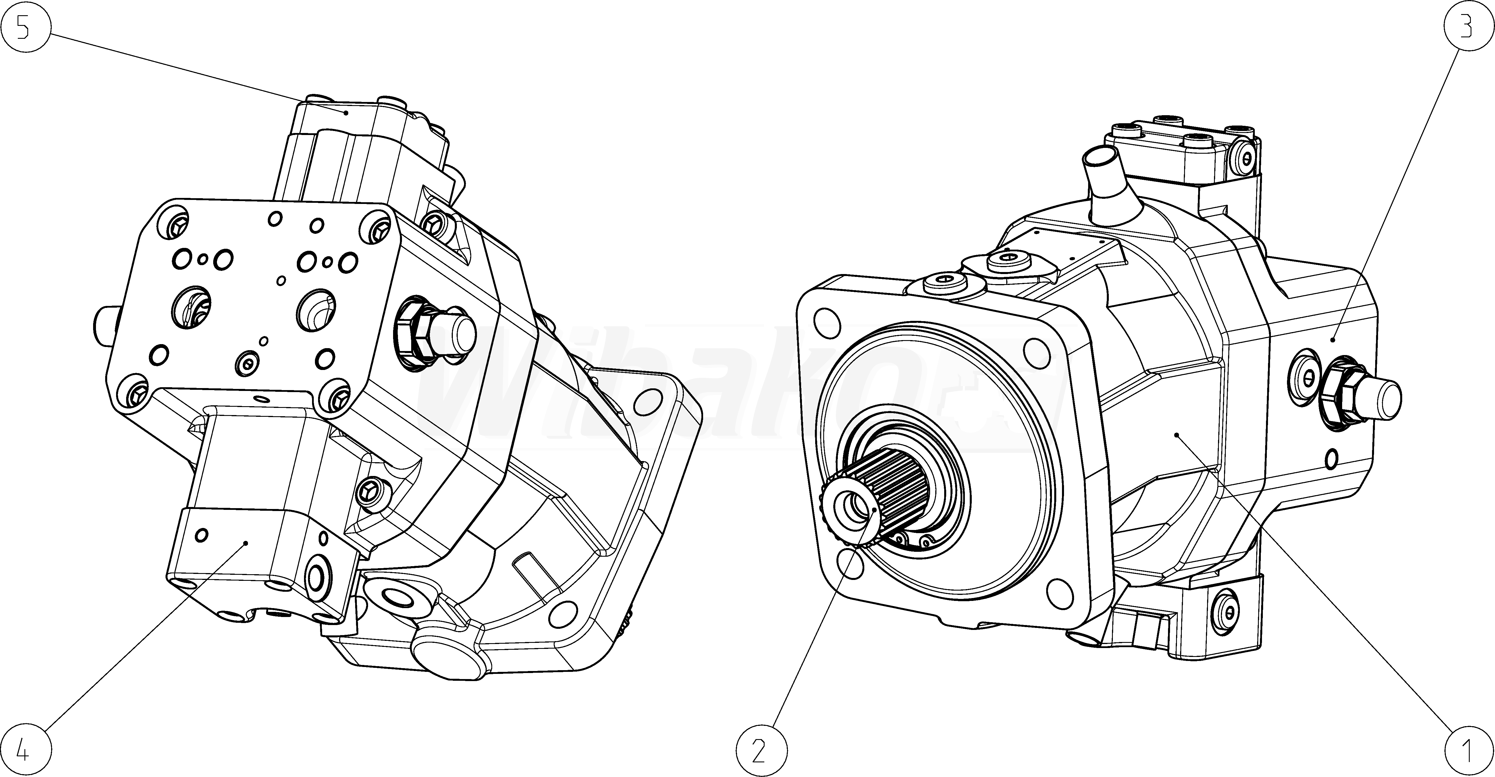 Axial piston variable motor A6VM Series 63. Geometric displacement 107 cm3. Control device: automatic control, high-pressure related, with minimum pressure increase Δp ≤ approx. 10 bar. Sealing material: FKM (fluoroelastomer). Splined shaft DIN 5480. Mounting flange ISO 3019-2, 4-hole. Port plate for working line: Port plate with 1-stage pressure relief valves for mounting a counterbalance valve, without valve. Without speed sensor.