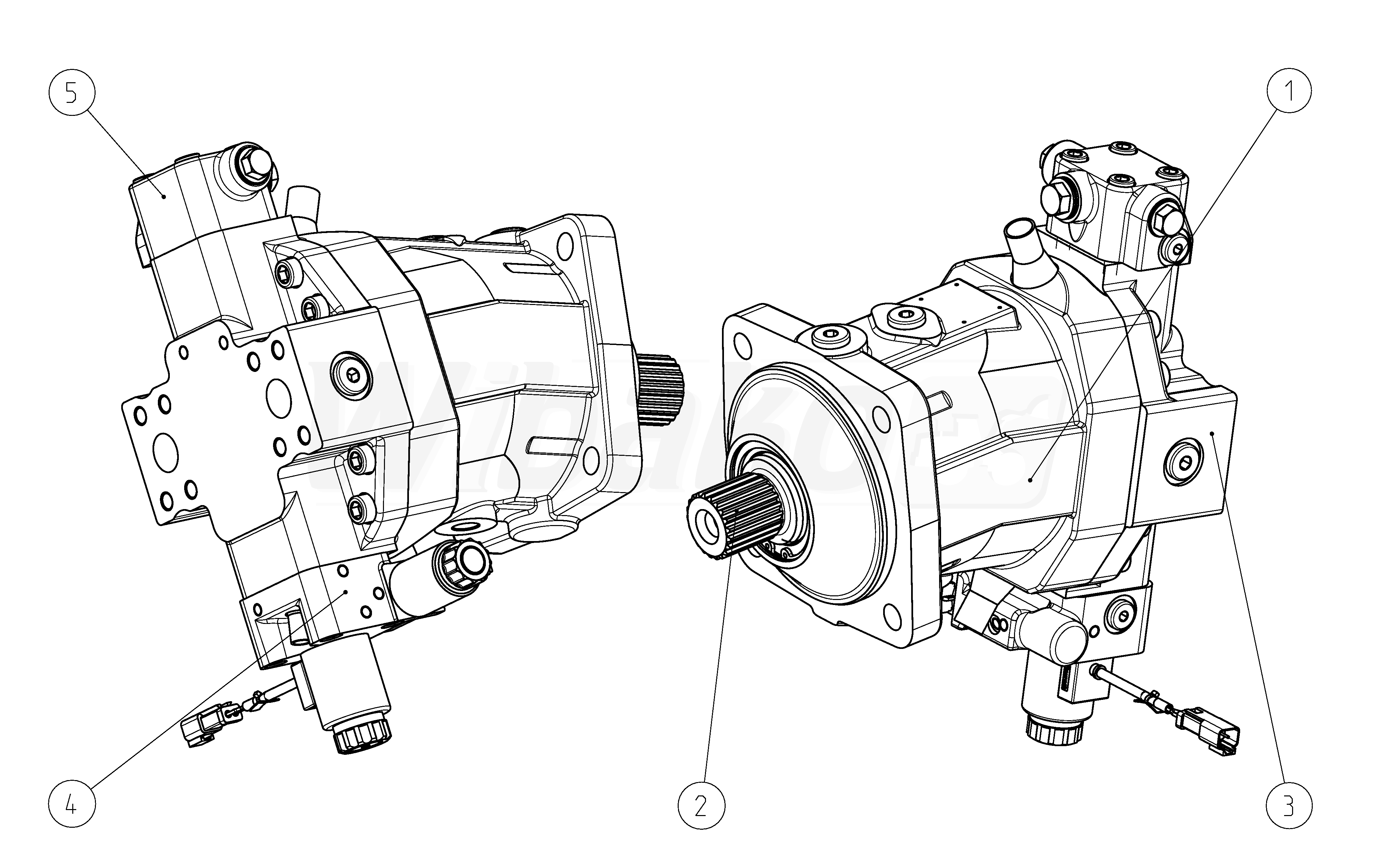 Axial piston variable motor A6VM Series 63. Geometric displacement 107 cm3. Control device: automatic control, high-pressure related, with pressure increase Δp = 100 bar. Sealing material: FKM (fluoroelastomer). Splined shaft DIN 5480. Mounting flange ISO 3019-2, 4-hole. Port plate for working line: SAE working ports A and B at rear, flushing and boost-pressure valve, mounted. Without speed sensor.