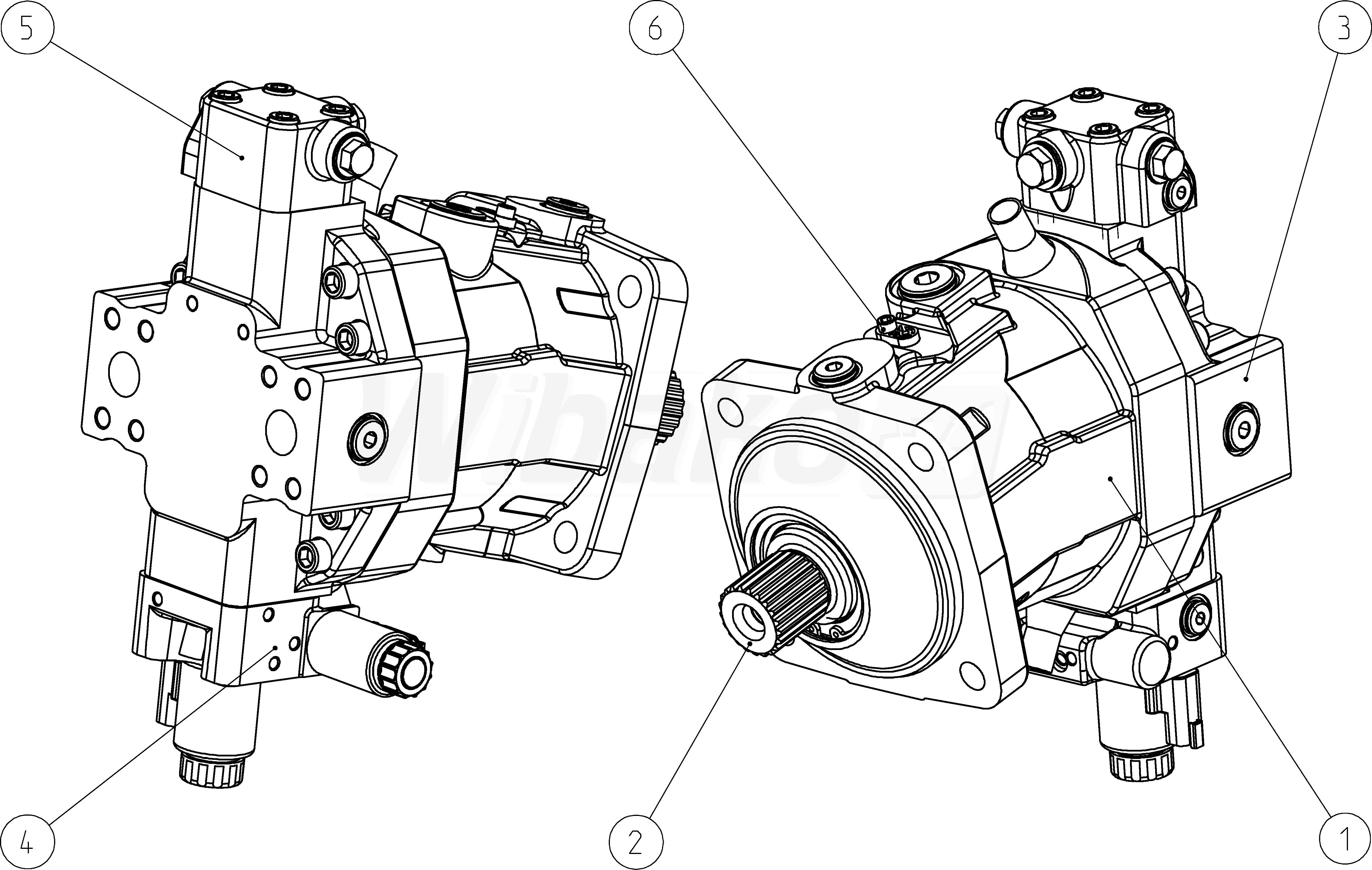 Axial piston variable motor A6VM Series 65. Geometric displacement 107 cm3. Control device: automatic control, high-pressure related, positive control, with pressure increase Δp = 100 bar. Override of controls, electric and travel direction valve, electric, U = 24 V DC. Connector for solenoids: DEUTSCH - molded connector, 2-pin, without suppressor diode. Without additional function. Damping one-sided in inlet to large stroking chamber. Setting range for displacement: Short Vg max setting screw, long (0-adjustable) Vg min setting screw. Metric, port threads with O-ring sealing according to ISO 6149. Sealing material: FKM (fluoroelastomer). Standard shaft bearing. Mounting flange ISO 3019-2 160-4. Splined shaft W45×2×21×9g. SAE working ports A and B at rear. With flushing and boost pressure valve, mounted flushing on both sides, flushing flow at: Δp = pND ‒ pG = 25 bar and v = 10 mm2/s (pND = low pressure, pG = case pressure). Flushing flow: 8. Prepared with speed sensor DSM/DSA. Standard version .