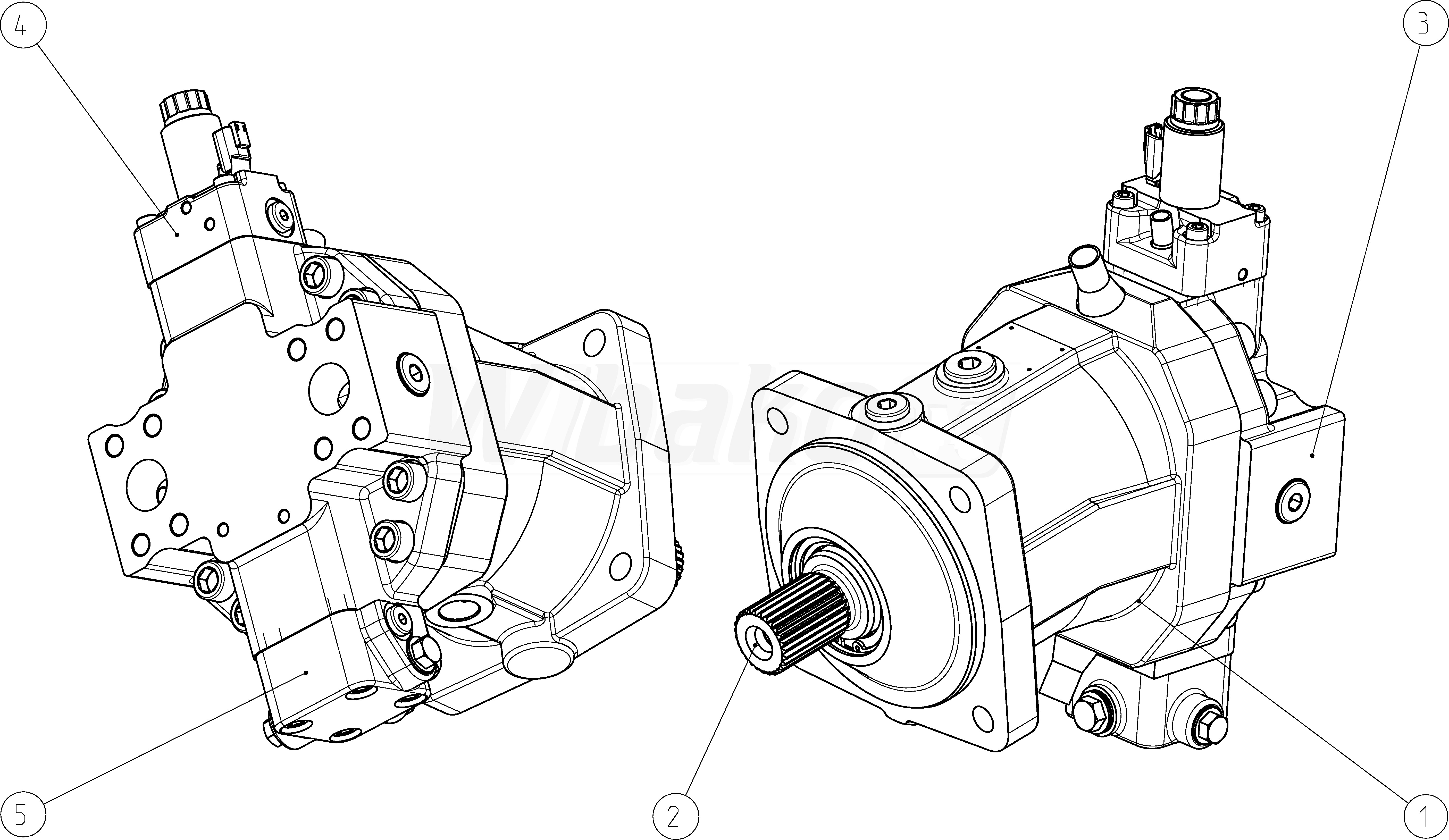 Axial piston variable motor A6VM Series 63. Geometric displacement 140 cm3. Control device: proportional control, electric, U = 12 V. Sealing material: FKM (fluoroelastomer). Mounting flange ISO 3019-2, 4-hole. Port plate for working line: SAE working ports A and B at rear, flushing and boost-pressure valve, mounted. Without speed sensor. DEUTSCH molded connector, 2-pin – without suppressor diode. Beginning of control at Vg max. Special version.