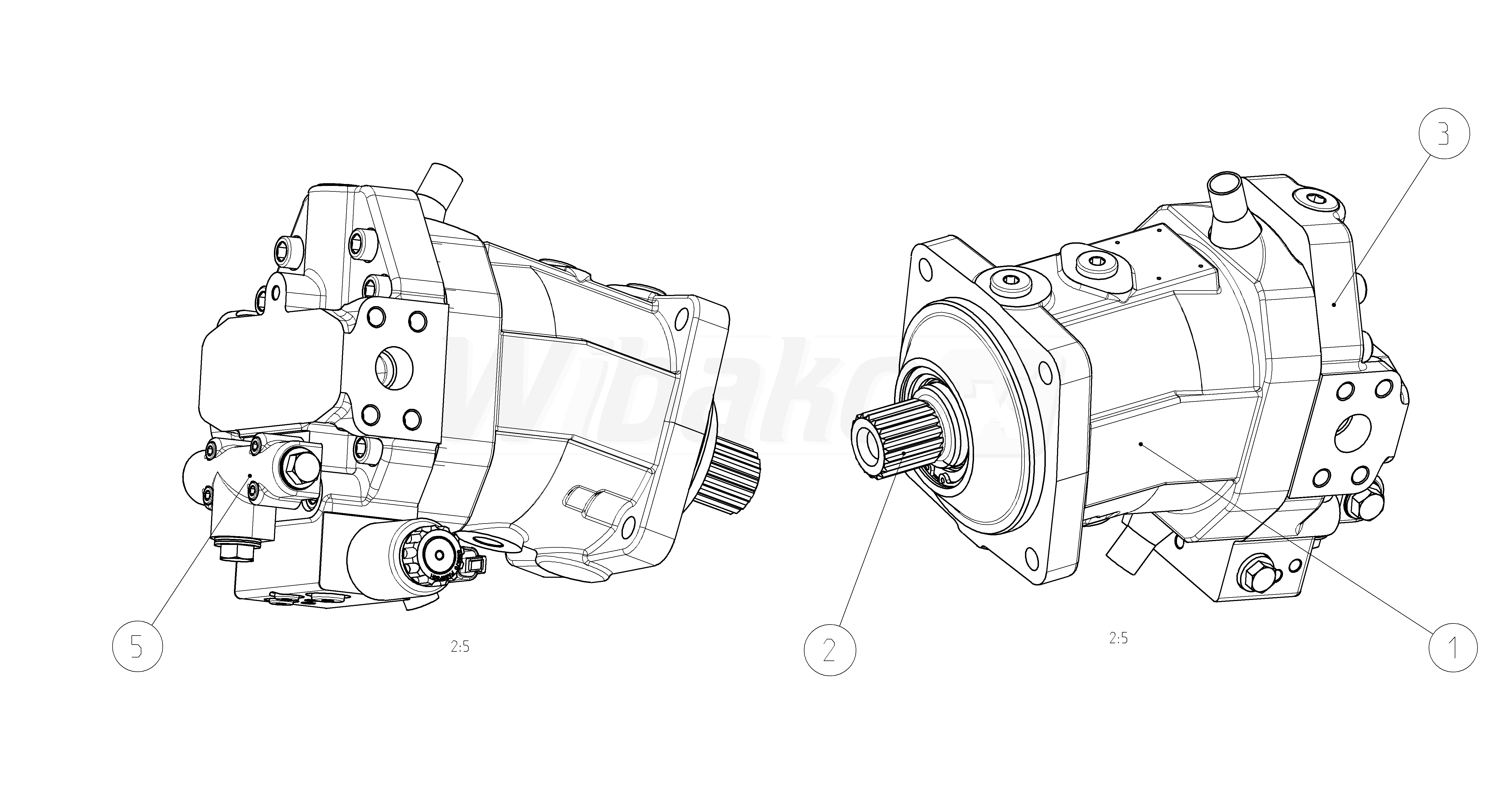 Axial piston variable motor A6VM Series 63. Geometric displacement 80 cm3. Control device: two-point control, electric, U = 24 V. Sealing material: FKM (fluoroelastomer). Splined shaft DIN 5480. Mounting flange ISO 3019-2, 4-hole. Port plate for working line: SAE working ports A and B lateral, opposite, flushing and boost-pressure valve, mounted. Without speed sensor. DEUTSCH molded connector, 2-pin – without suppressor diode. Beginning of control at Vg max.