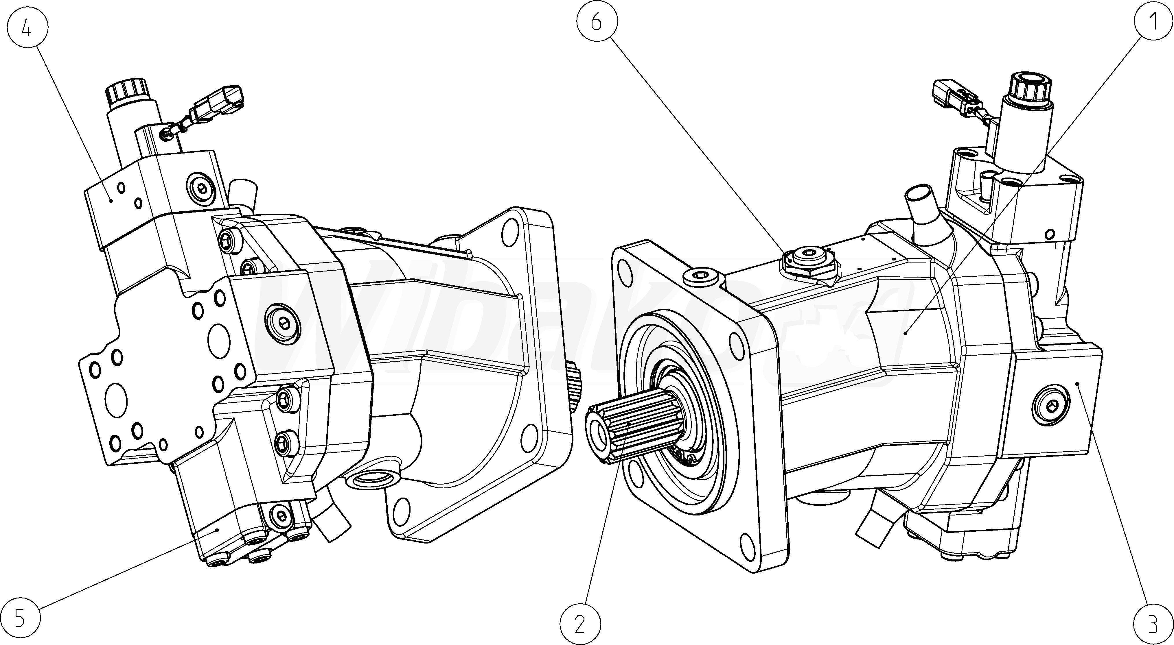 Axial piston variable motor A6VM Series 63. Geometric displacement 107 cm3. Control device: proportional control, electric, U = 24 V. Sealing material: FKM (fluoroelastomer). Splined shaft ANSI B92.1a. Mounting flange ISO 3019-2, SAE J744 ‒ 4-bolt 165-4. Port plate for working line: SAE working ports A and B at rear, without valve.