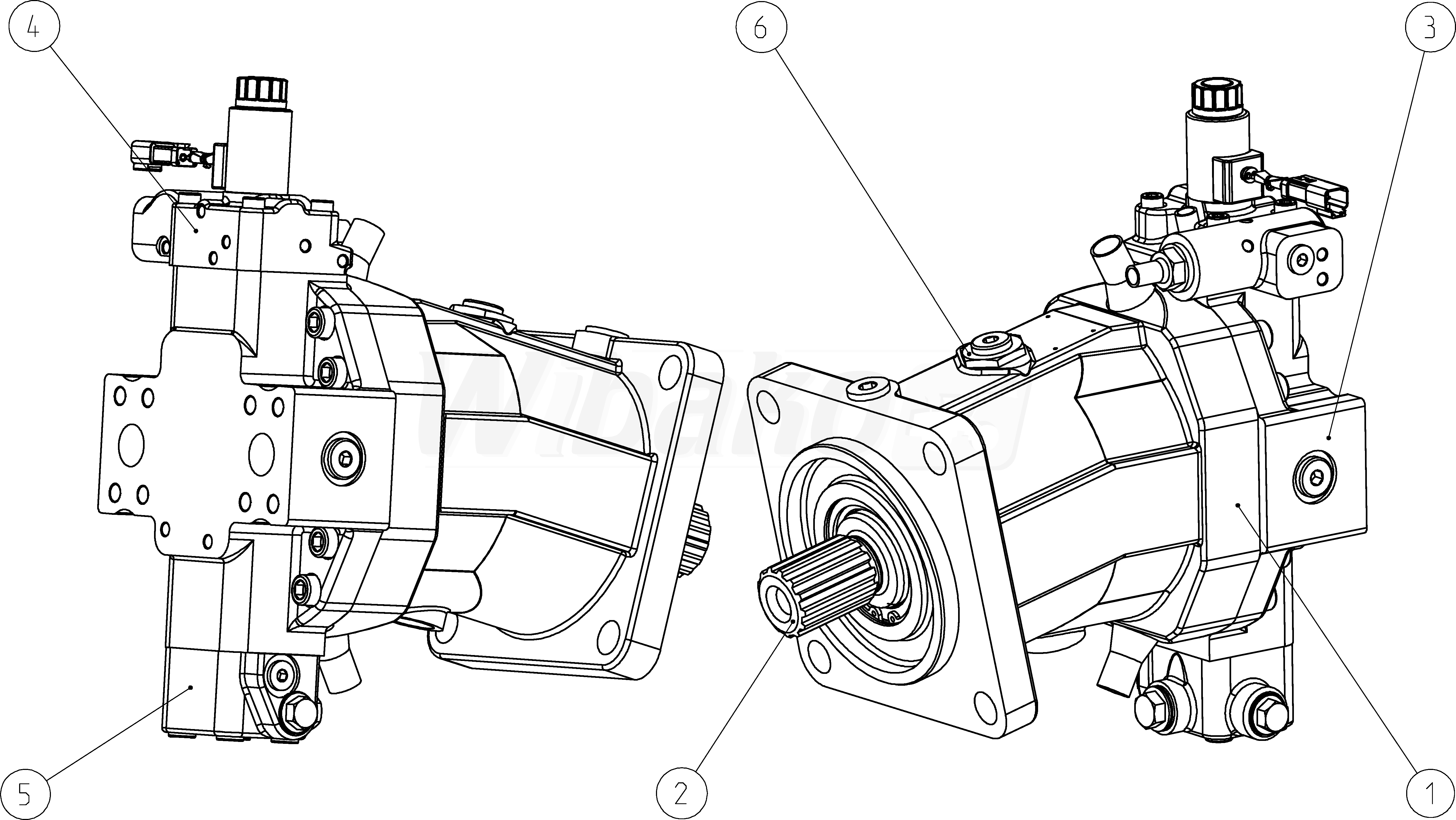 Axial piston variable motor A6VM Series 63. Geometric displacement 107 cm3. Control device: proportional control, electric, U = 12 V. Sealing material: FKM (fluoroelastomer). Splined shaft ANSI B92.1a. Mounting flange ISO 3019-2, SAE J744 ‒ 4-bolt 165-4. Port plate for working line: SAE working ports A and B at rear, flushing and boost-pressure valve, mounted.