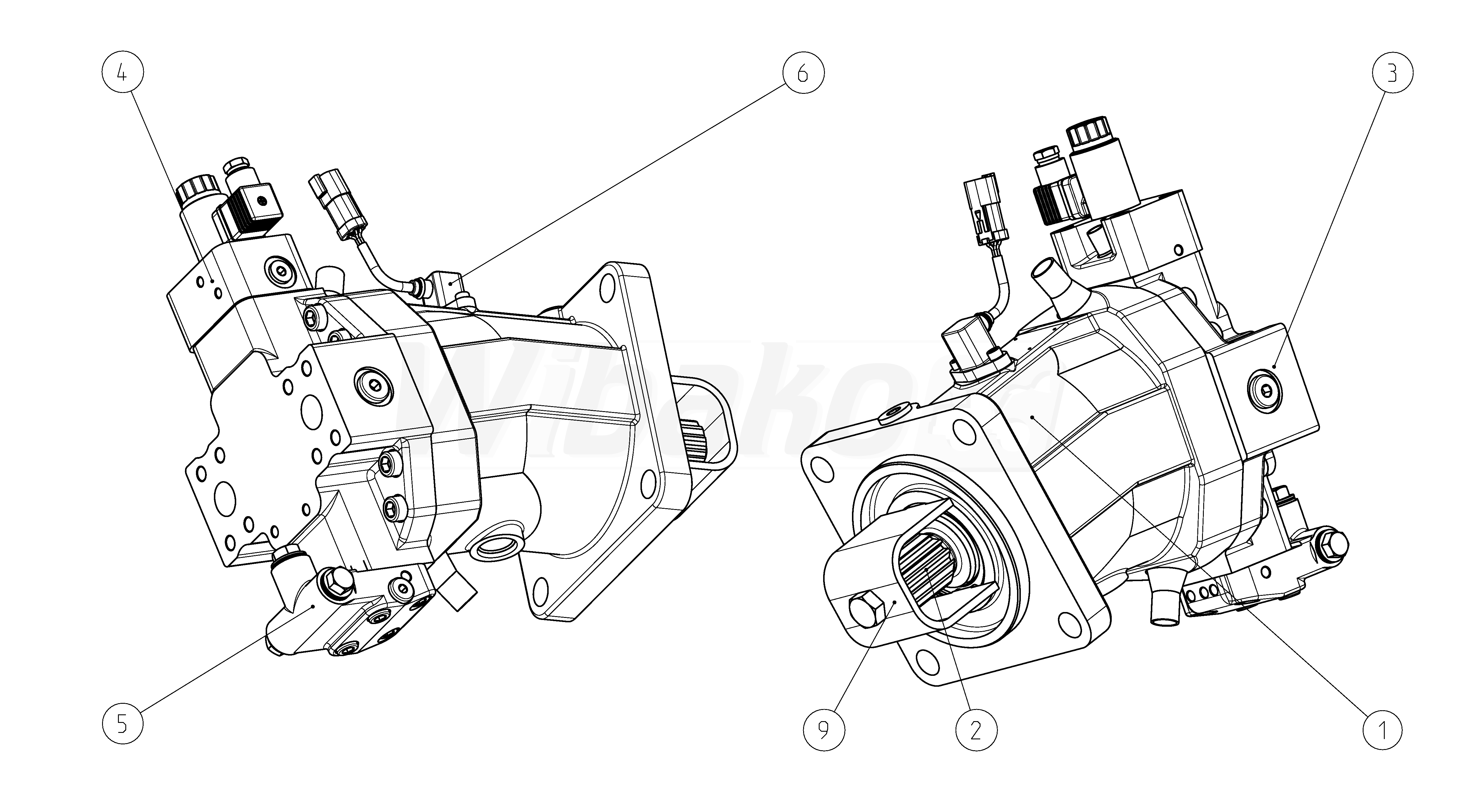 Axial piston variable motor A6VM Series 63. Geometric displacement 107 cm3. Control device: proportional control, electric, U = 24 V. Sealing material: FKM (fluoroelastomer). Splined shaft ANSI B92.1a. Mounting flange ISO 3019-2, SAE J744 ‒ 4-bolt 165-4.