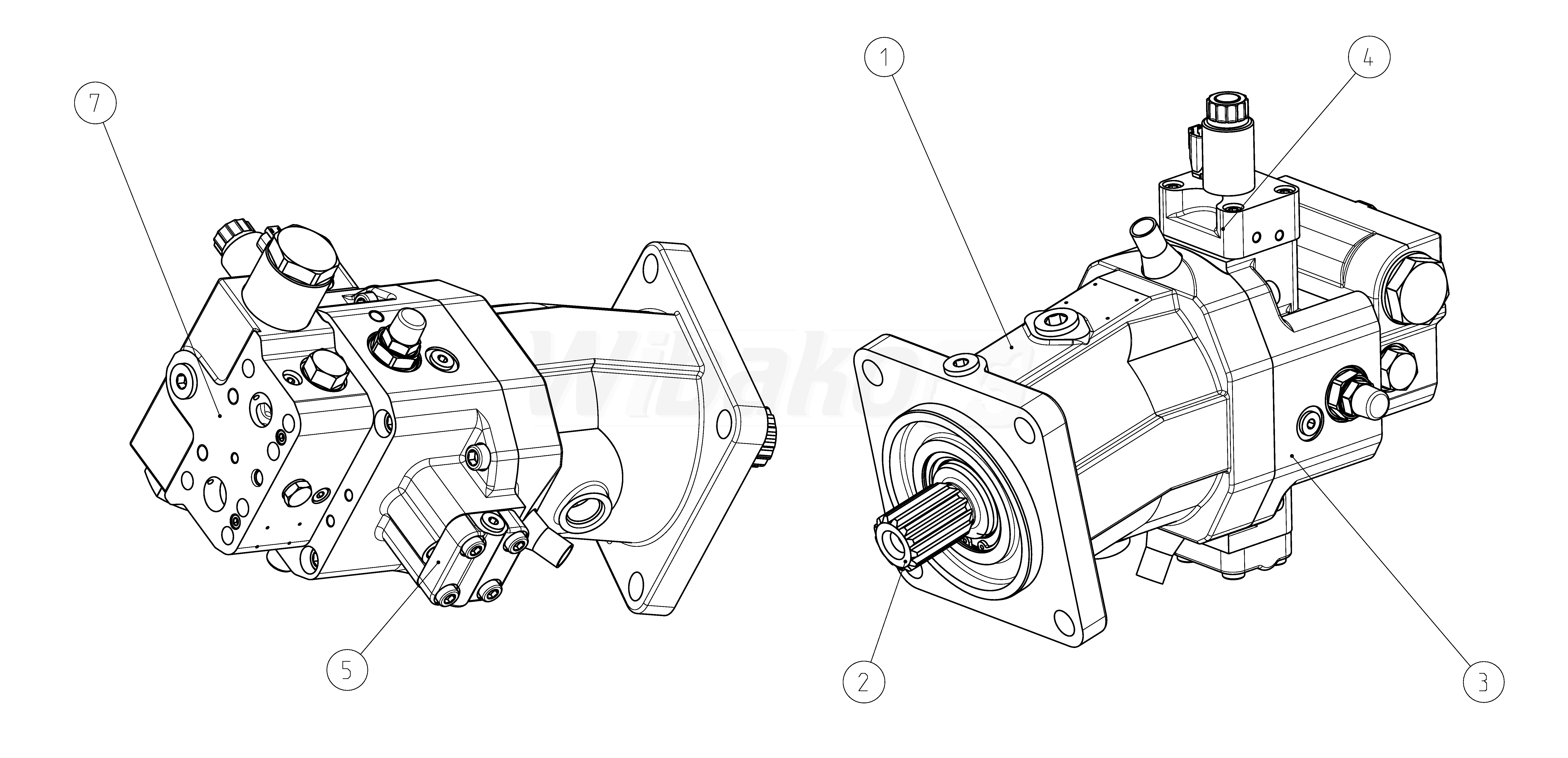 Axial piston variable motor A6VM Series 63. Geometric displacement 107 cm3. Control device: two-point control, electric, U = 24 V. Sealing material: FKM (fluoroelastomer). Splined shaft ANSI B92.1a. Mounting flange ISO 3019-2, SAE J744 ‒ 4-bolt 165-4. Port plate for working line: Port plate with 1-stage pressure relief valves for mounting a counterbalance valve, counterbalance valve mounted Without speed sensor. DEUTSCH molded connector, 2-pin – without suppressor diode. Beginning of control at Vg max. Special version.