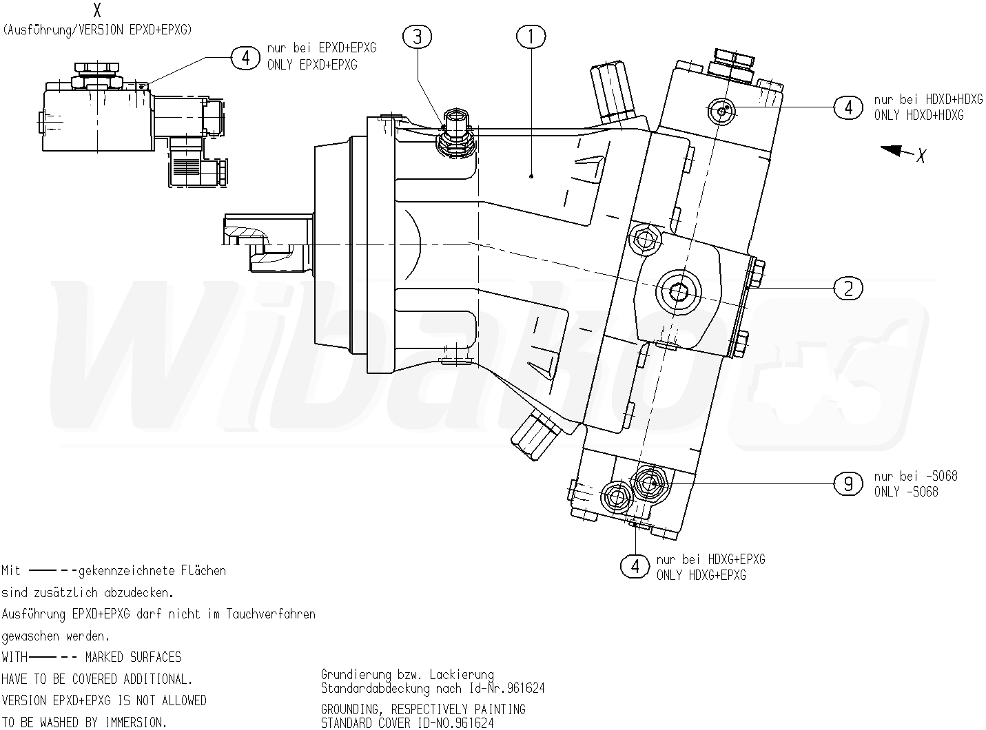 Axial piston variable motor A6VM Series 63. Geometric displacement 250 cm3. Control device: proportional control, hydraulic, Setting ranges for displacement: Vg min = 0 to 0.4 Vg max Vg max = Vg max to 0.8 Vg max. Mounting flange ISO 3019-2, Beginning of control at Vg max.
