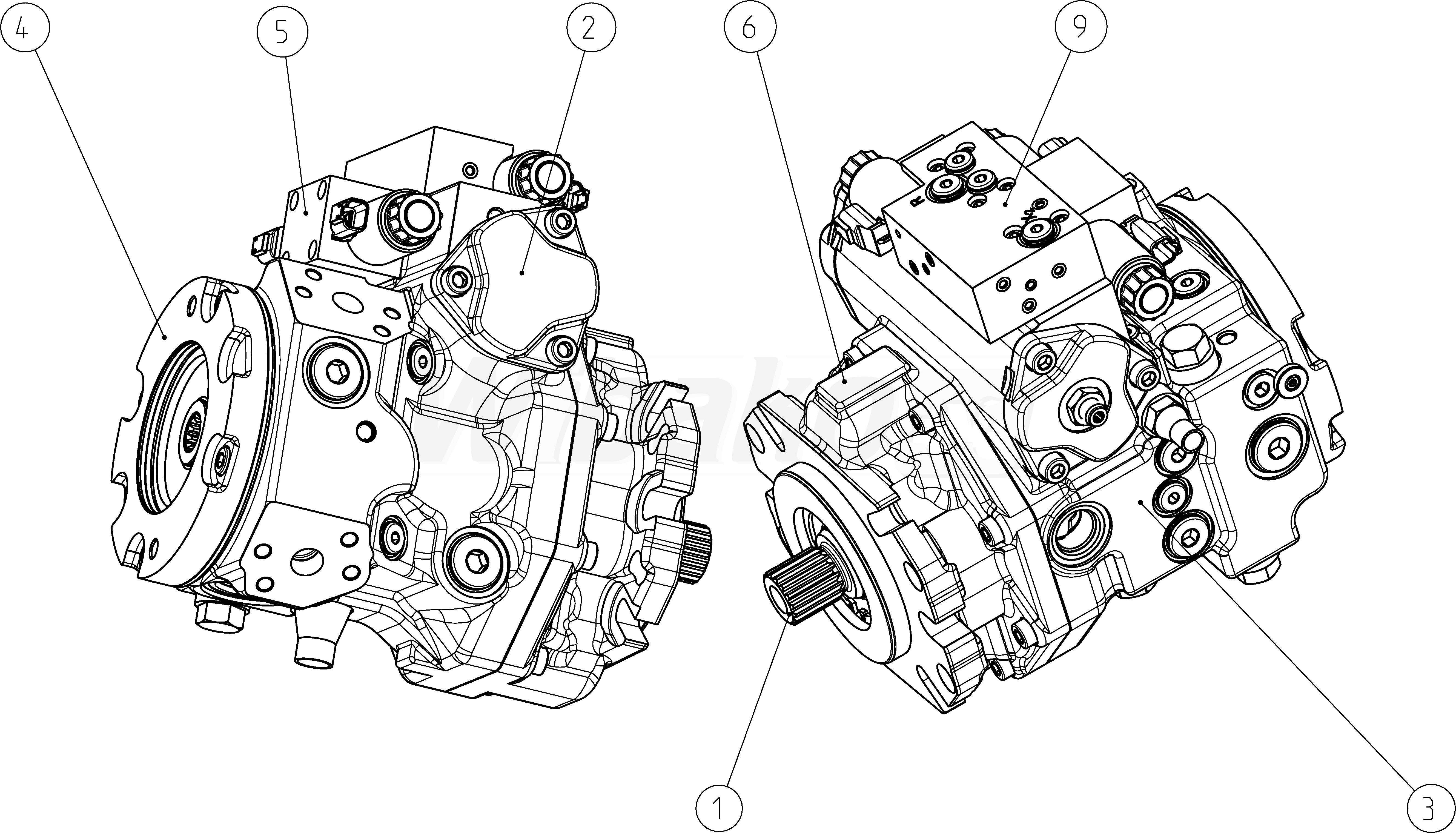 Axial piston variable pump A4VG, swashplate design, nominal pressure 450 bar, maximum pressure 500 bar. Pump, closed circuit. Geometric displacement 065 cm3. Series 40. Metric ports according to ISO 6149 with O-ring seal, metric fastening thread according to DIN 13. Direction of rotation: clockwise (viewed on drive shaft). Sealing material: NBR (nitrile rubber), shaft seal in FKM (fluoroelastomer). Mounting flange SAE J744 127-2/4. SAE working port A and B, on left side (45° left). Standard rotary group, boost pump integrated, standard internal gear pump. Flange SAE J744: diameter- 101-2 (B), mounting- verical, code- B1. Hub for splined shaft: diameter- 7/8 in 13T 16/32DP, code- S4. High-pressure relief valve, direct operated, fixed setting, with low-pressure relief valve, fixed setting. Filtration in the boost pump suction line. Special version.