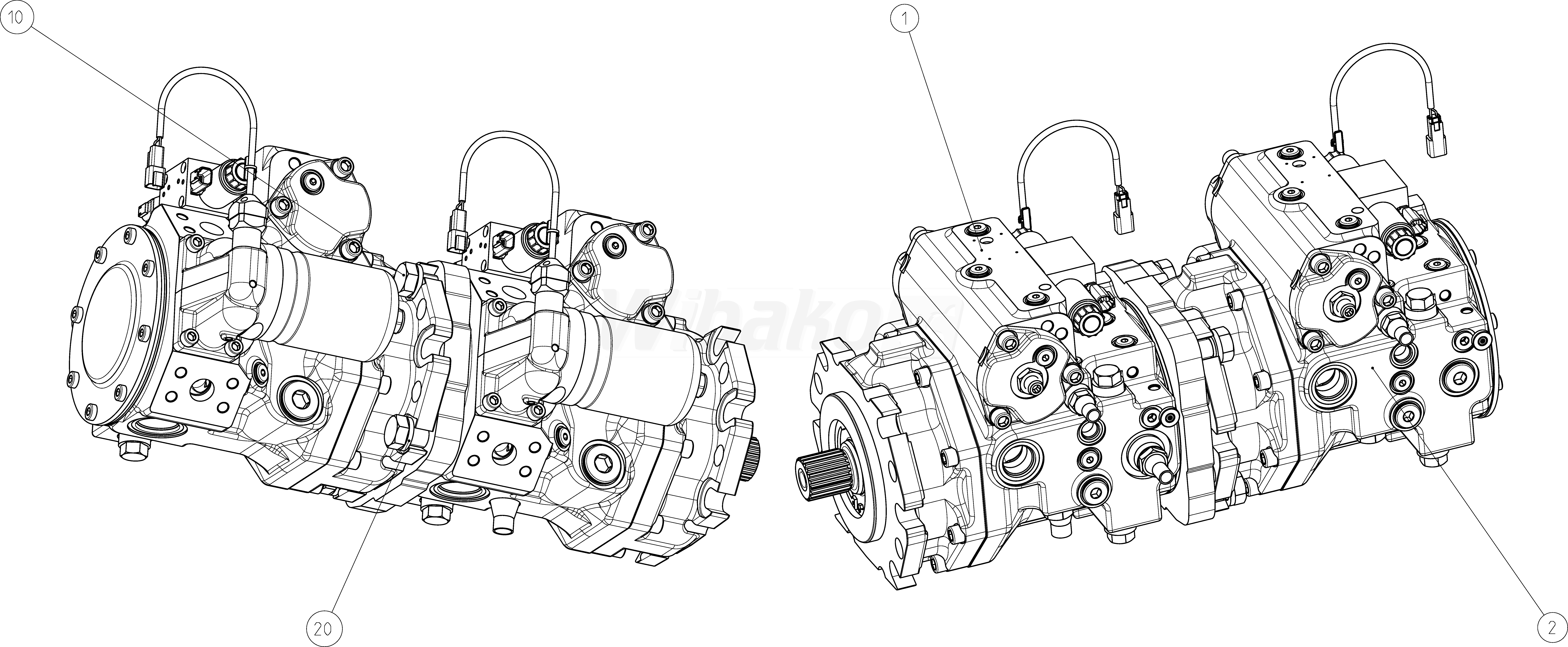 2. Axial piston variable pump A4VG, swashplate design, nominal pressure 450 bar, maximum pressure 500 bar. Pump, closed circuit. Geometric displacement 110 cm3. Two-point control, electric U = 24 V. Pressure cut-off, with bypass. Fixed setting, hydraulic, mechanical. DEUTSCH molded connector, 2-pin – without suppressor diode. Without swivel angle sensor. Stroking chamber pressure port X3 X4. Without DA control valve. Series 40.