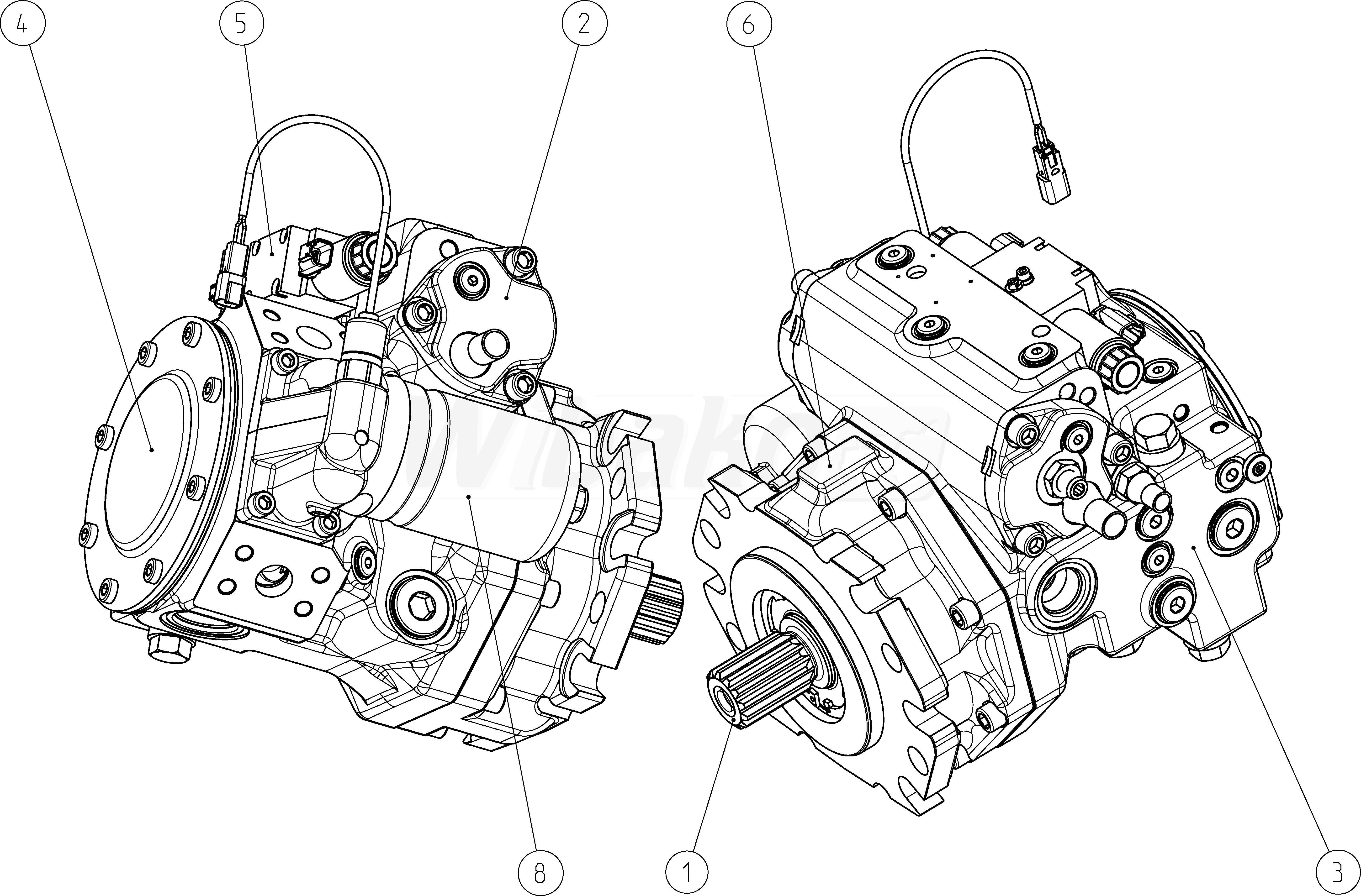 Axial piston variable pump A4VG, swashplate design, nominal pressure 450 bar, maximum pressure 500 bar. Pump, closed circuit. Geometric displacement 110 cm3. Proportional control, electric U = 24 V. Pressure cut-off, with bypass. Fixed setting, hydraulic, mechanical. DEUTSCH molded connector, 2-pin – without suppressor diode. Without swivel angle sensor. Mechanical stroke limiter and stroking chamber pressure port X3 X4. Without DA control valve. Series 40. Metric ports according to ISO 6149 with O-ring seal, metric fastening thread according to DIN 13. Direction of rotation: counter-clockwise (viewed on drive shaft). Sealing material: NBR (nitrile rubber), shaft seal in FKM (fluoroelastomer). Mounting flange SAE J744 152-2/4. Splined shaft ANSI B92.1a–1976 1 3/4 in 13T 8/16DP. SAE working port A and B, on left side (45° left). Standard rotary group, boost pump integrated, standard internal gear pump. Without through drive. High-pressure relief valve, direct operated, fixed setting, with low-pressure relief valve, fixed setting. Filtration in the boost pump pressure line. Attachment filter with cold start valve and electric contamination indicator – DEUTSCH connector.