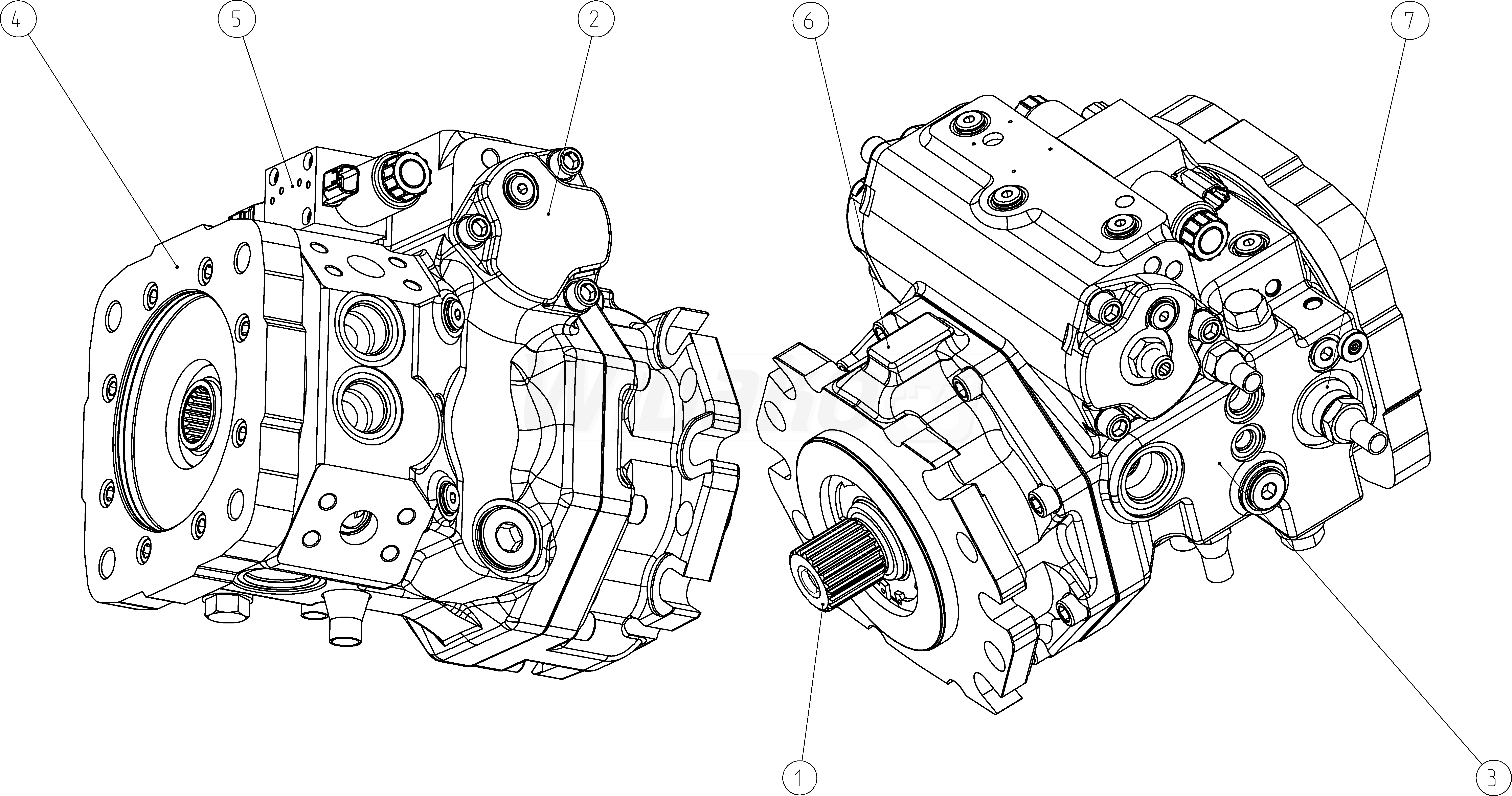 Axial piston variable pump A4VG, swashplate design, nominal pressure 450 bar, maximum pressure 500 bar. Pump, closed circuit. Geometric displacement 110 cm3. Automatic control, speed related U = 24 V. Pressure cut-off, with bypass. Fixed setting, hydraulic, mechanical. DEUTSCH molded connector, 2-pin – without suppressor diode. Without swivel angle sensor. Stroking chamber pressure port X3 X4. DA control valve, fixed setting, ports for pilot control device. Series 40. Metric ports according to ISO 6149 with O-ring seal, metric fastening thread according to DIN 13. Direction of rotation: counter-clockwise (viewed on drive shaft). Sealing material: NBR (nitrile rubber), shaft seal in FKM (fluoroelastomer). Mounting flange SAE J744 152-2/4. Splined shaft DIN 5480 W45×2×21×9g. SAE working port A and B, on left side (45° left). Standard rotary group, boost pump integrated, standard internal gear pump. Filtration in the boost pump pressure line. Attachment filter with cold start valve and electric contamination indicator – DEUTSCH connector.