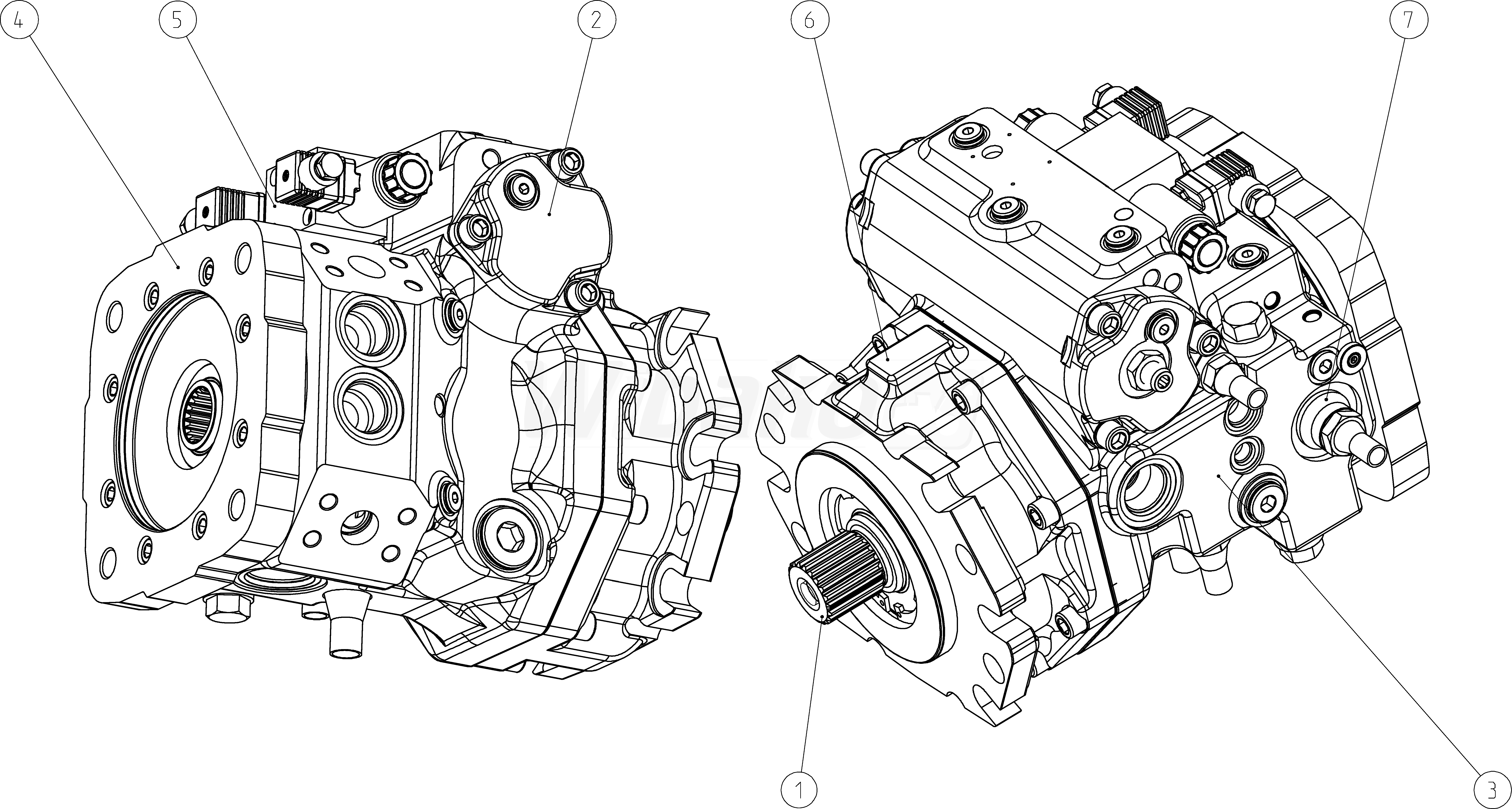 Axial piston variable pump A4VG, swashplate design, nominal pressure 450 bar, maximum pressure 500 bar. Pump, closed circuit. Geometric displacement 110 cm3. Automatic control, speed related U = 24 V. Pressure cut-off, with bypass. Fixed setting, hydraulic, mechanical. Series 40. Metric ports according to ISO 6149 with O-ring seal, metric fastening thread according to DIN 13. Direction of rotation: counter-clockwise (viewed on drive shaft). Sealing material: NBR (nitrile rubber), shaft seal in FKM (fluoroelastomer). Mounting flange SAE J744 152-2/4. Splined shaft DIN 5480 W45×2×21×9g. SAE working port A and B, on left side (45° left). Standard rotary group, boost pump integrated, standard internal gear pump. Filtration in the boost pump pressure line. Attachment filter with cold start valve and electric contamination indicator – DEUTSCH connector. Special version.