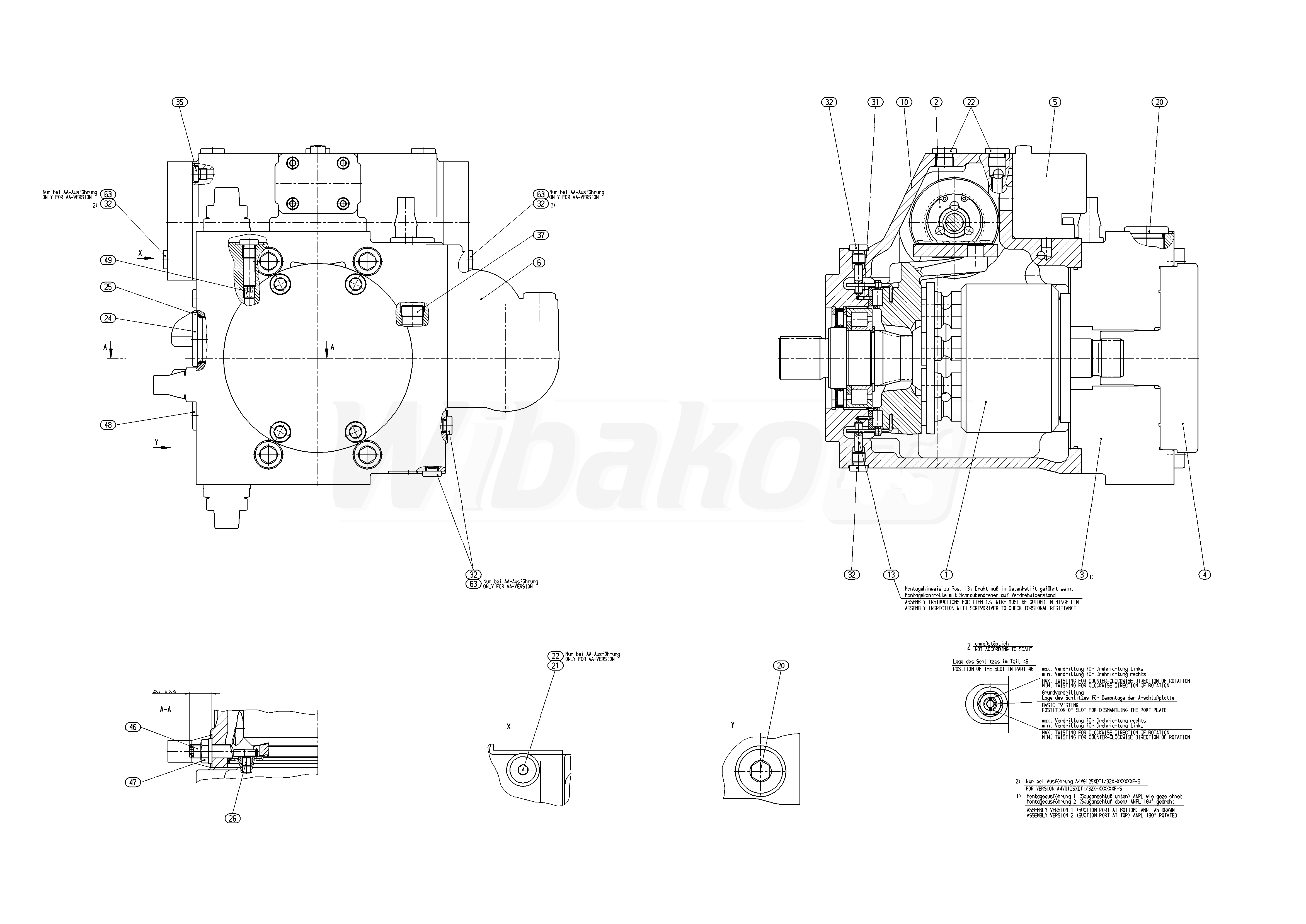 Axial piston variable pump A4VG. Geometric displacement 125 cm3. Pressure cut-off. Series 3, index 2. Direction of rotation (viewed on drive shaft): clockwise. Sealing material: NBR (nitrile rubber), shaft seal in FKM (fluoroelastomer). Splined shaft DIN 5480 for single pump. Mounting flange SAE J744 2+4-hole. SAE working port A and B, top and bottom Suction port S bottom. Integrated boost pump. Flange SAE J744 127-2 (C), hub for splined shaft 1 1/4 in 14T 12/24DP. High pressure relief valve, pilot operated 100 to 420 bar with bypass. Filtration in the boost pump pressure line. Attachment filter with cold start valve.