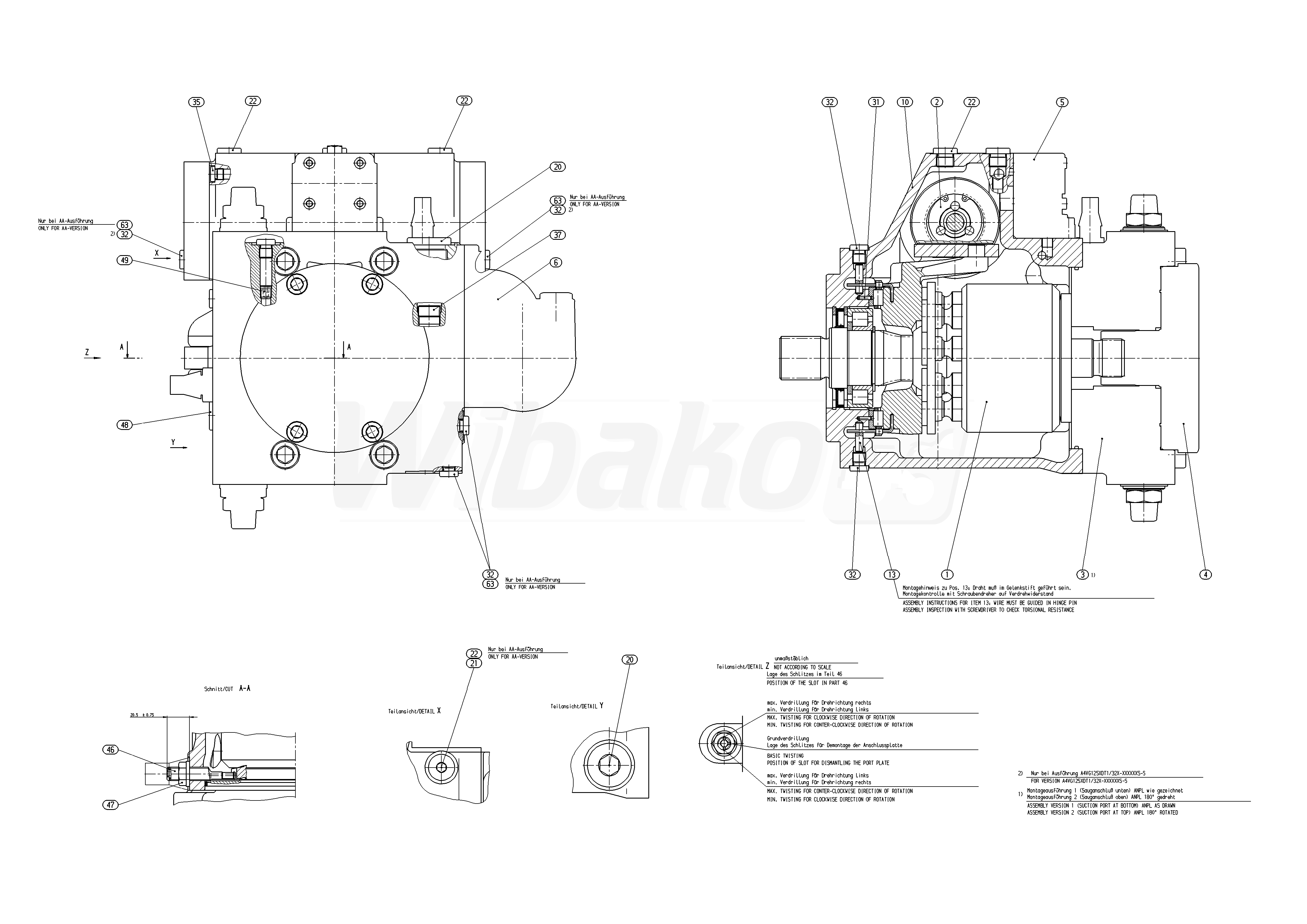 Axial piston variable pump A4VG. Geometric displacement 125 cm3. Pressure cut-off. Series 3, index 2. Direction of rotation (viewed on drive shaft): clockwise. Sealing material: NBR (nitrile rubber), shaft seal in FKM (fluoroelastomer). Splined shaft DIN 5480 for single pump. Mounting flange SAE J744 2+4-hole. SAE working port A and B, top and bottom Suction port S bottom. Integrated boost pump. Flange SAE J744 127-2 (C), hub for splined shaft 1 1/4 in 14T 12/24DP. High pressure relief valve, pilot operated 100 to 420 bar with bypass. Filtration in the boost pump pressure line. Attachment filter with cold start valve. DEUTSCH molded connector, 2-pin without suppressor diode.