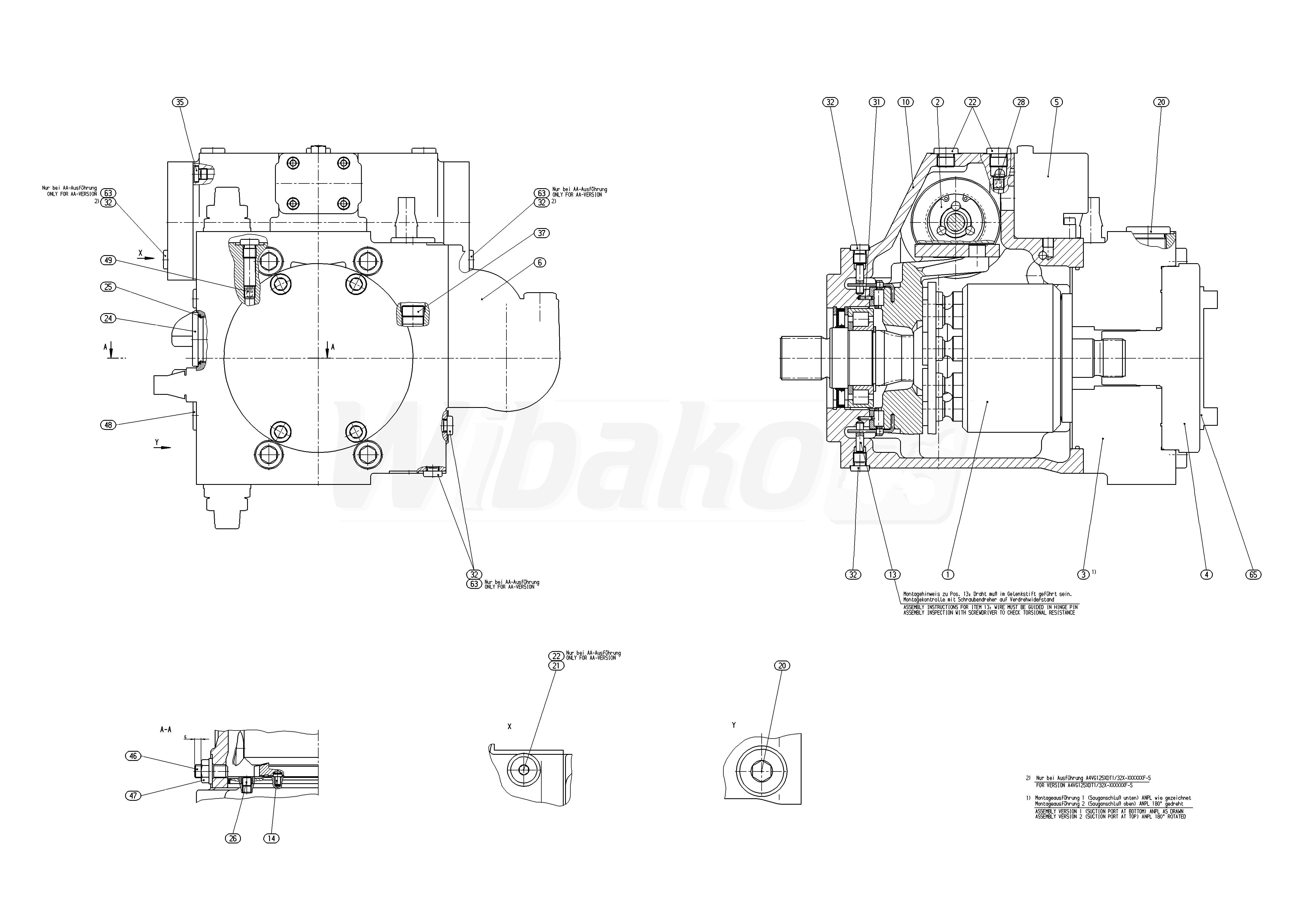 Axial piston variable pump A4VG. Geometric displacement 125 cm3. Pressure cut-off. Stroking chamber pressure port X3, X4. Without DA control valve. Series 3, index 2. Direction of rotation (viewed on drive shaft): counter-clockwise. Sealing material: NBR (nitrile rubber), shaft seal in FKM (fluoroelastomer). Splined shaft DIN 5480 for single pump. Mounting flange SAE J744 2+4-hole. SAE working port A and B, top and bottom Suction port S bottom. Integrated boost pump. Flange SAE J744 101-2 (B), hub for splined shaft 7/8 in 13T 16/32DP. High pressure relief valve, pilot operated 100 to 420 bar with bypass. Filtration in the boost pump pressure line. Attachment filter with cold start valve.
