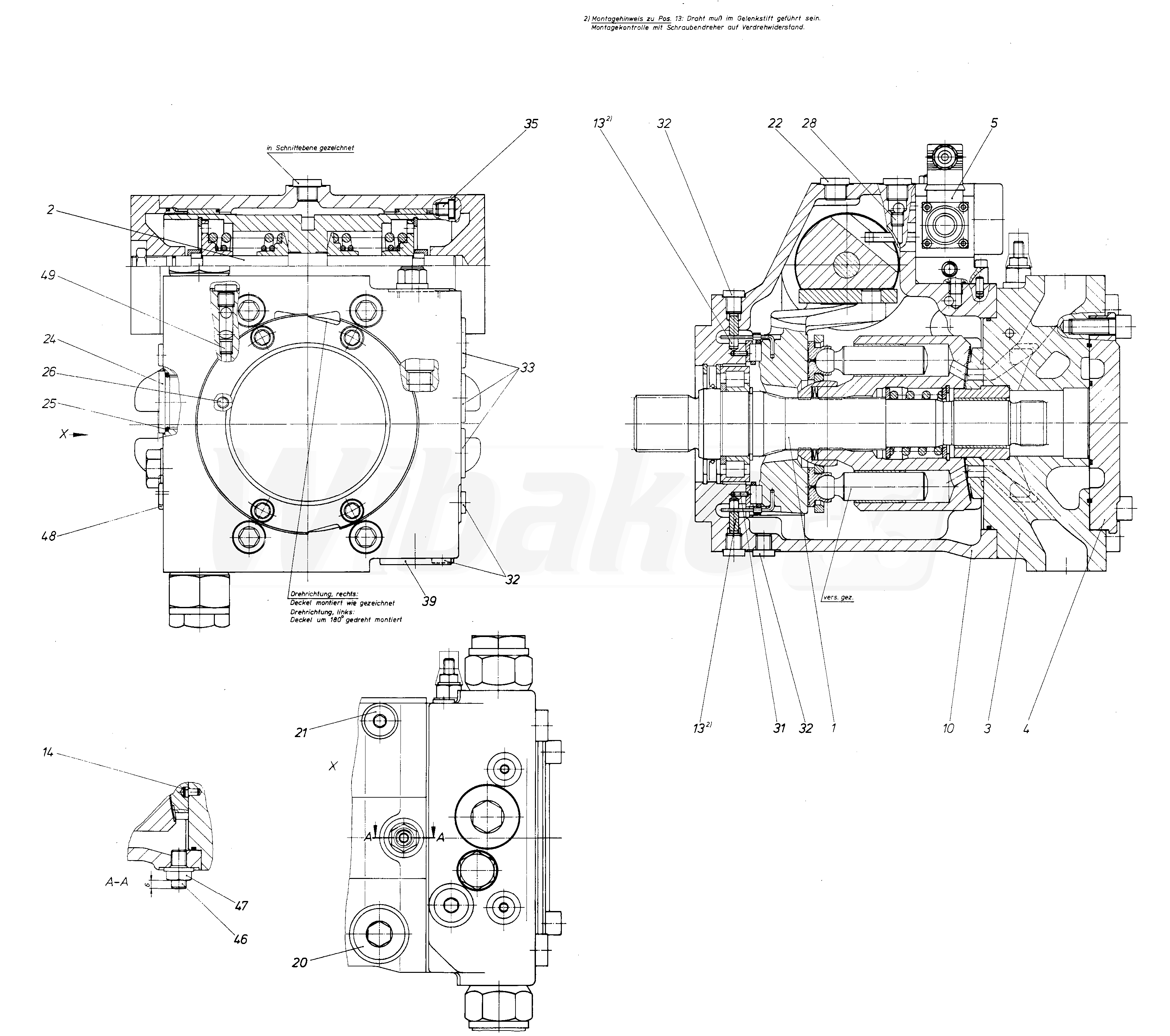 Axial piston variable pump A4VG. Geometric displacement 125 cm3. Pressure cut-off. Without DA control valve. Series 3, index 2. Direction of rotation (viewed on drive shaft): clockwise. Sealing material: NBR (nitrile rubber), shaft seal in FKM (fluoroelastomer). Splined shaft DIN 5480 for combination pump – 1st pump. Mounting flange SAE J744 2+4-hole. SAE working port A and B, top and bottom Suction port S bottom. Without integrated boost pump. Without through drive. High-pressure relief valve, direct operated, fixed setting 250 to 420 bar without bypass. External boost pressure supply.