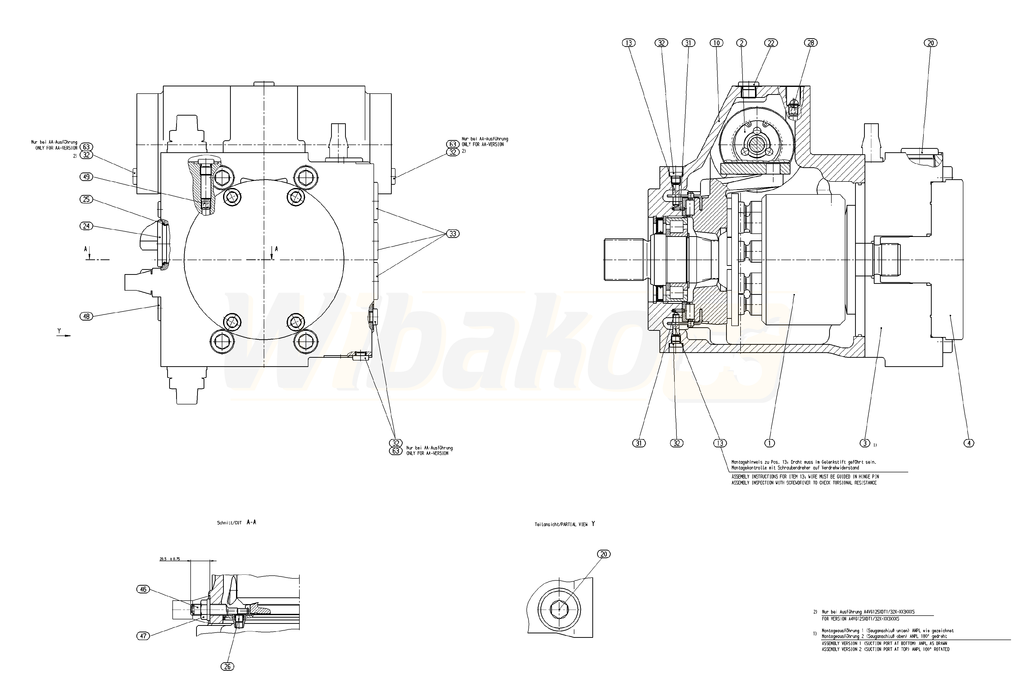 Axial piston variable pump A4VG. Geometric displacement 125 cm3. Hydraulic control, direct operated. Pressure cut-off. Stroking chamber pressure port X3, X4. Without DA control valve. Series 3, index 2. Direction of rotation (viewed on drive shaft): counter-clockwise. Sealing material: NBR (nitrile rubber), shaft seal in FKM (fluoroelastomer). Splined shaft DIN 5480 for combination pump – 1st pump. Mounting flange SAE J744 2+4-hole. SAE working port A and B, top and bottom Suction port S bottom. Integrated boost pump. Flange SAE J744 101-2 (B), hub for splined shaft 7/8 in 13T 16/32DP. High pressure relief valve, pilot operated 100 to 420 bar with bypass. Filtration in the boost pump suction line.