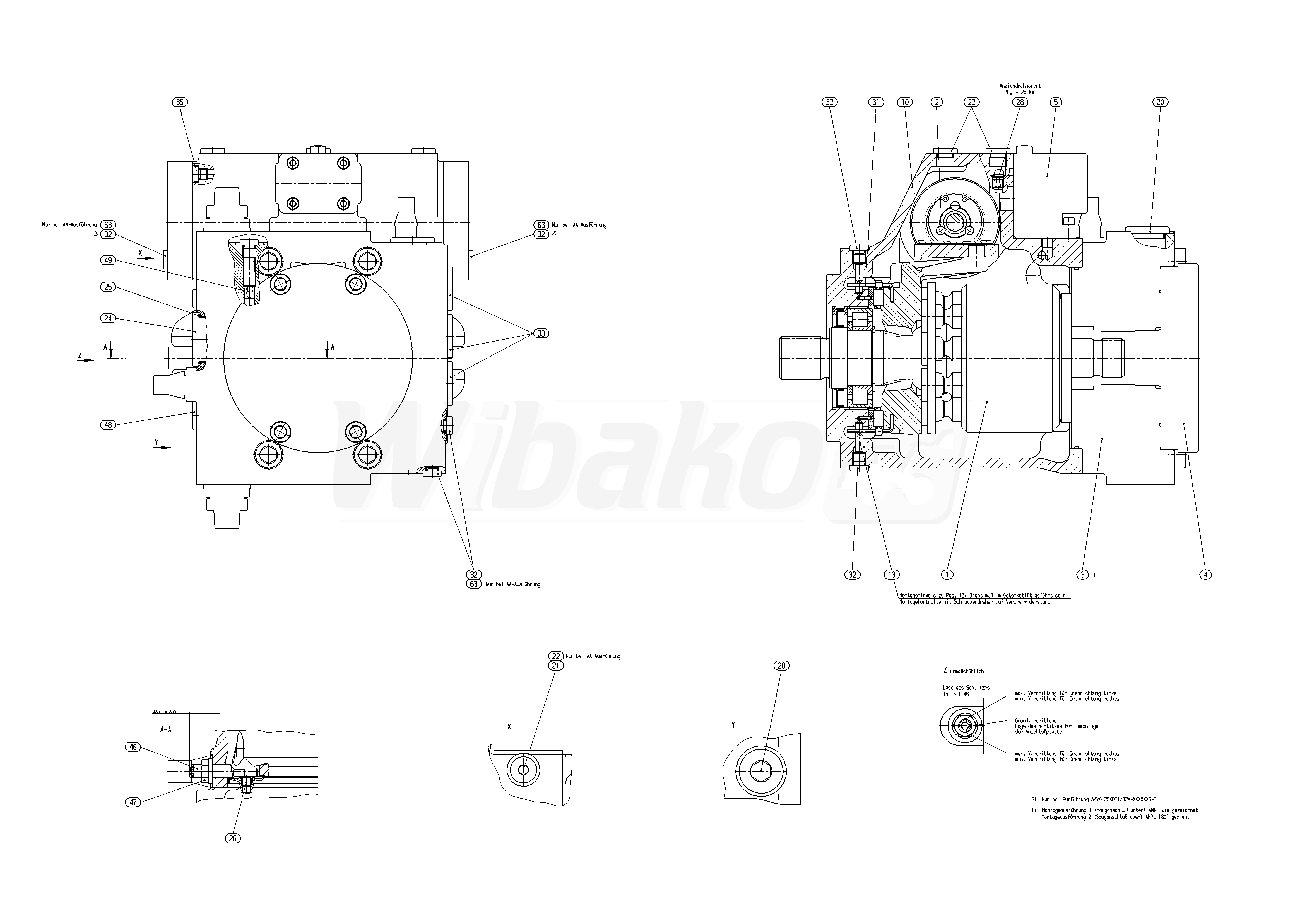 Axial piston variable pump A4VG. Geometric displacement 125 cm3. Pressure cut-off. Series 3, index 2. Direction of rotation (viewed on drive shaft): counter-clockwise. Sealing material: NBR (nitrile rubber), shaft seal in FKM (fluoroelastomer). Splined shaft DIN 5480 for single pump. Mounting flange SAE J744 2+4-hole. SAE working port A and B, top and bottom Suction port S bottom. Integrated boost pump. Without through drive. High pressure relief valve, pilot operated 100 to 420 bar with bypass. Filtration in the boost pump suction line.