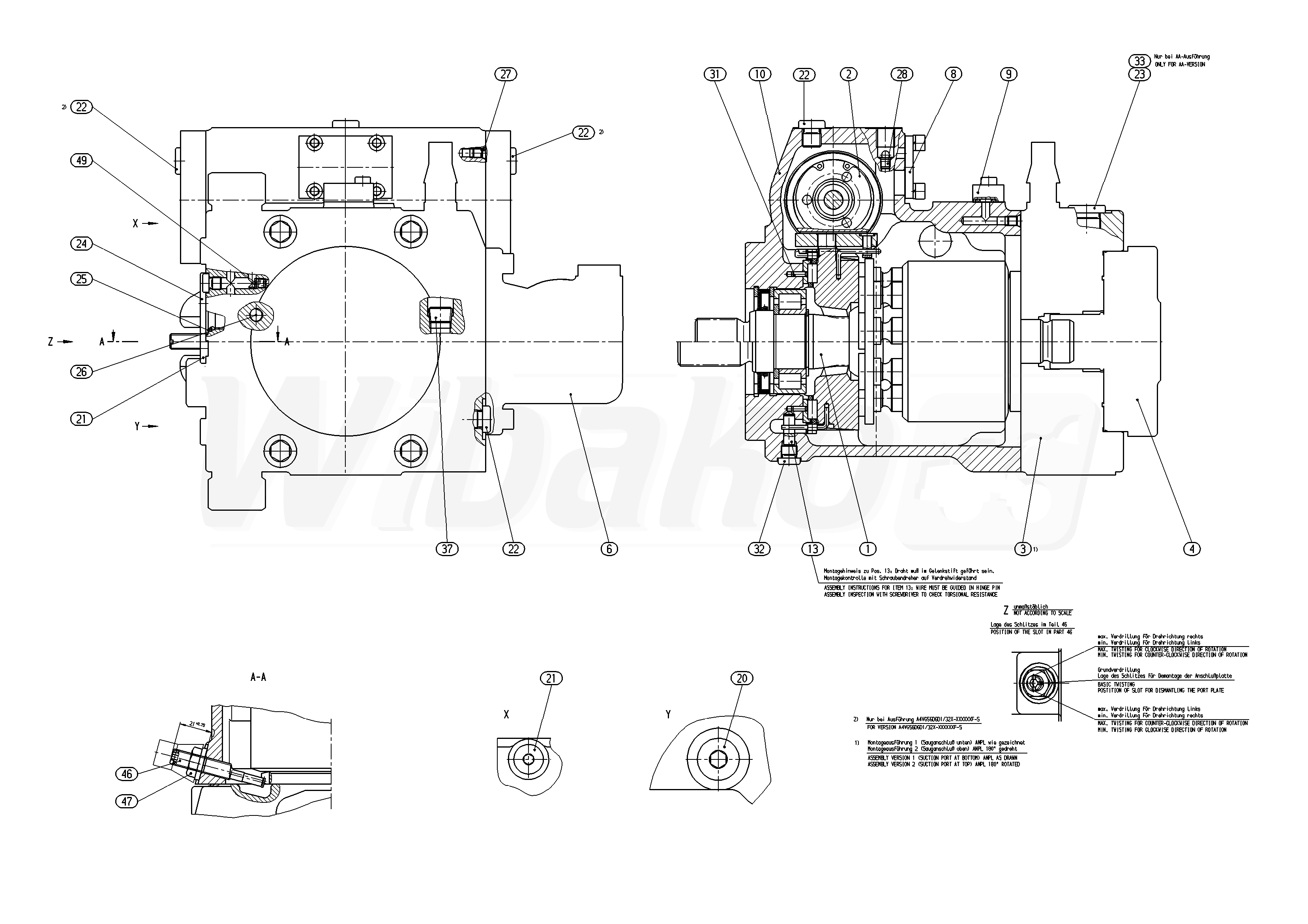 Axial piston variable pump A4VG. Geometric displacement 56 cm3. Hydraulic control, direct operated. Pressure cut-off. Without DA control valve. Series 3, index 2. Direction of rotation (viewed on drive shaft): clockwise. Sealing material: NBR (nitrile rubber), shaft seal in FKM (fluoroelastomer). Splined shaft ANSI B92.1a for single pump. Mounting flange SAE J744 2-hole. Integrated boost pump. Flange SAE J744 127-2 (C), hub for splined shaft 1 1/4 in 14T 12/24DP. High-pressure relief valve, direct operated, fixed setting 250 to 420 bar with bypass. Filtration in the boost pump pressure line. Attachment filter with cold start valve.