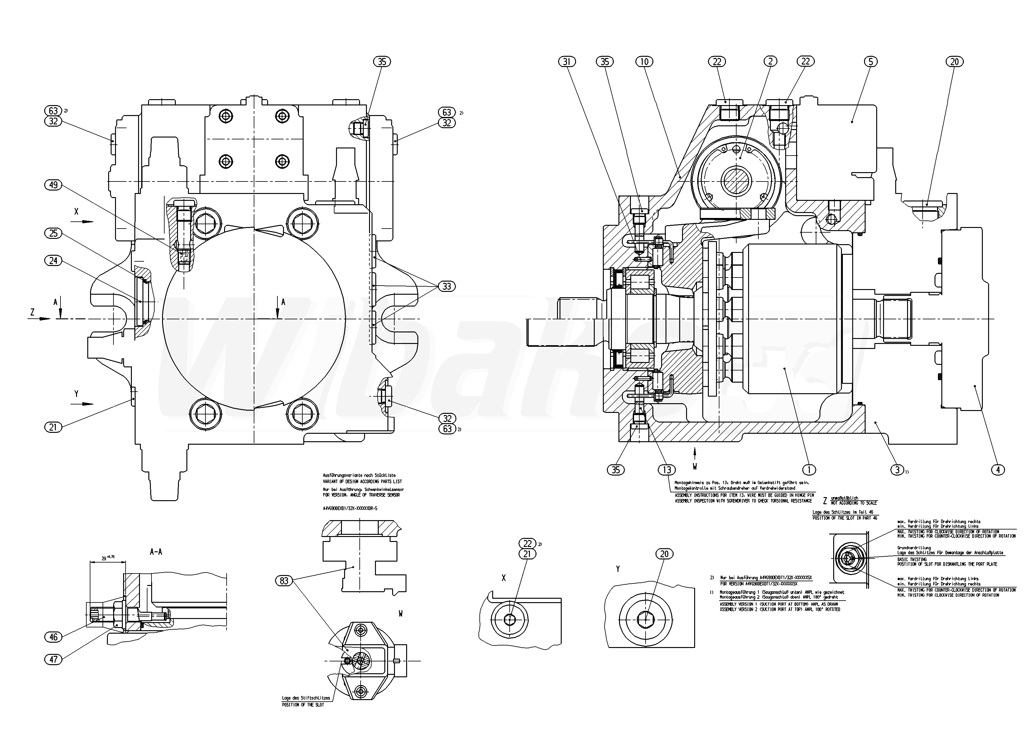 Axial piston variable pump A4VG. Geometric displacement 90 cm3. Pressure cut-off. Series 3, index 2. Direction of rotation (viewed on drive shaft): counter-clockwise. Sealing material: NBR (nitrile rubber), shaft seal in FKM (fluoroelastomer). Splined shaft ANSI B92.1a for single pump. Mounting flange SAE J744 2+4-hole.