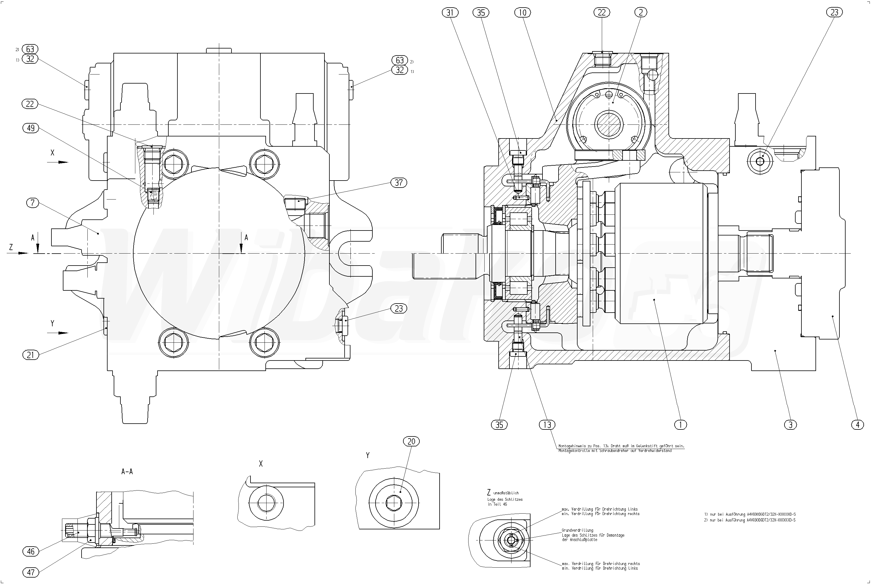 Axial piston variable pump A4VG. Geometric displacement 90 cm3. Hydraulic control, direct operated. Pressure cut-off. DA control valve, fixed setting. Series 3, index 2. Direction of rotation (viewed on drive shaft): clockwise. Sealing material: NBR (nitrile rubber), shaft seal in FKM (fluoroelastomer). Splined shaft DIN 5480 for single pump. Mounting flange SAE J744 2+4-hole.