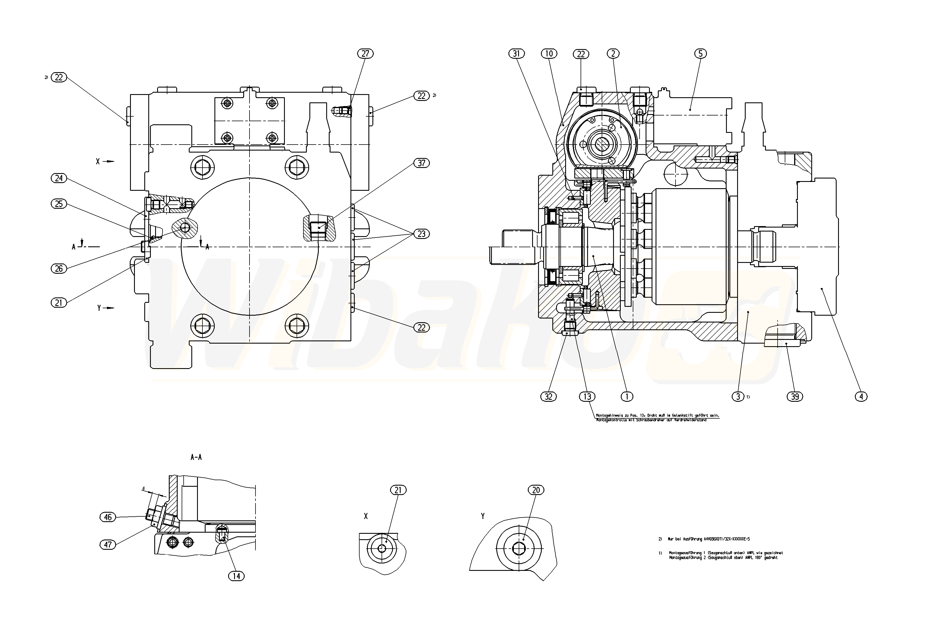 Axial piston variable pump A4VG. Geometric displacement 56 cm3. Pressure cut-off. Without DA control valve. Series 3, index 2. Direction of rotation (viewed on drive shaft): clockwise. Sealing material: NBR (nitrile rubber), shaft seal in FKM (fluoroelastomer). Splined shaft ANSI B92.1a for combination pump – 1st pump. Mounting flange SAE J744 2-hole. Without integrated boost pump. Flange SAE J744 101-2 (B), hub for splined shaft 7/8 in 13T 16/32DP. High-pressure relief valve, direct operated, fixed setting 250 to 420 bar without bypass. External boost pressure supply.