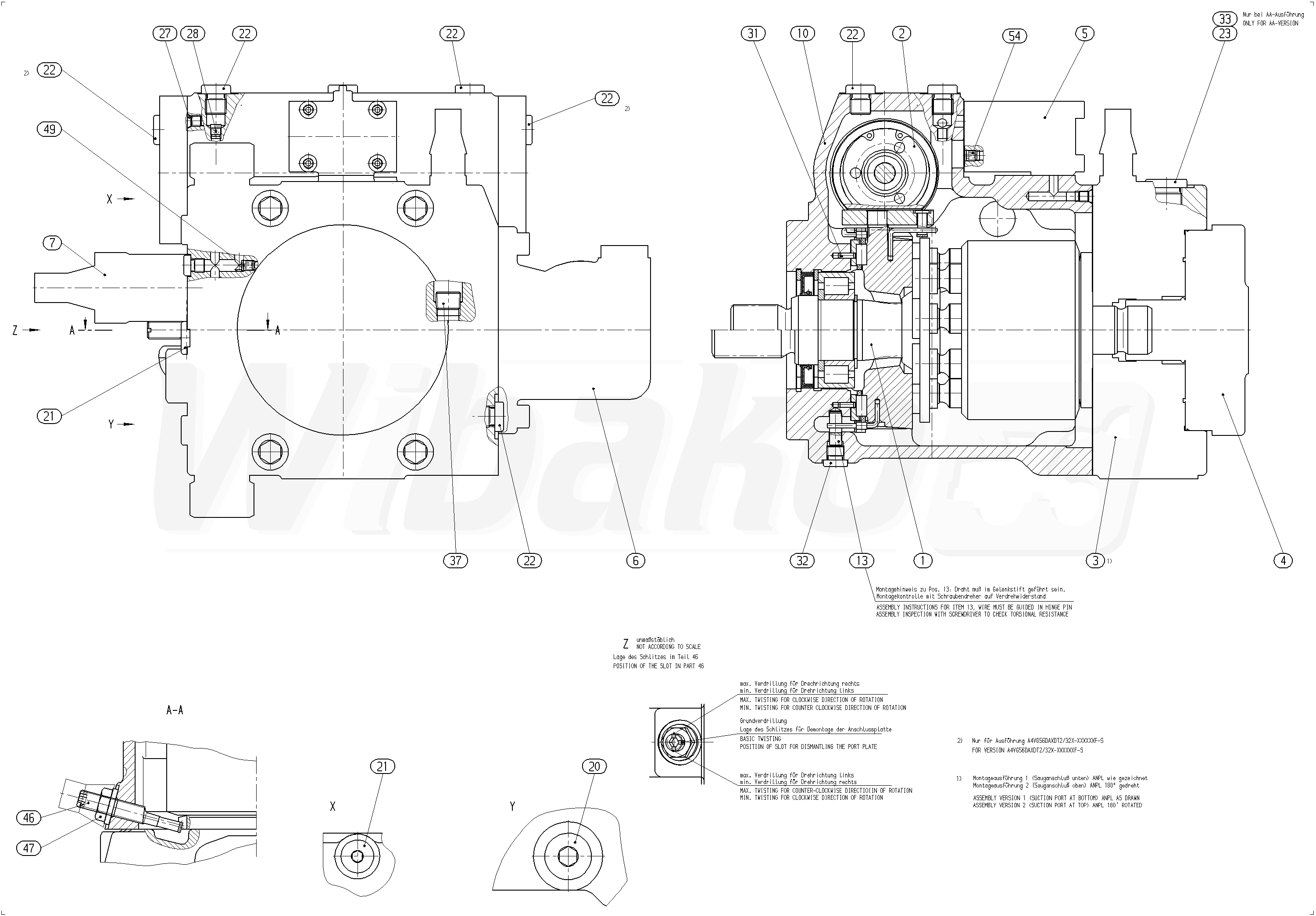 Axial piston variable pump A4VG. Geometric displacement 56 cm3. Automatic control, speed related U = 12 V. Pressure cut-off. Mechanical stroke limiter, externally adjustable. Stroking chamber pressure port X3, X4. DA control valve, fixed setting. Series 3, index 2. Direction of rotation (viewed on drive shaft): clockwise. Sealing material: NBR (nitrile rubber), shaft seal in FKM (fluoroelastomer). Splined shaft ANSI B92.1a for single pump. Mounting flange SAE J744 2-hole. Integrated boost pump. Without through drive. High-pressure relief valve, direct operated, fixed setting 100 to 250 bar with bypass. Filtration in the boost pump pressure line. Attachment filter with cold start valve and visual contamination indicator.