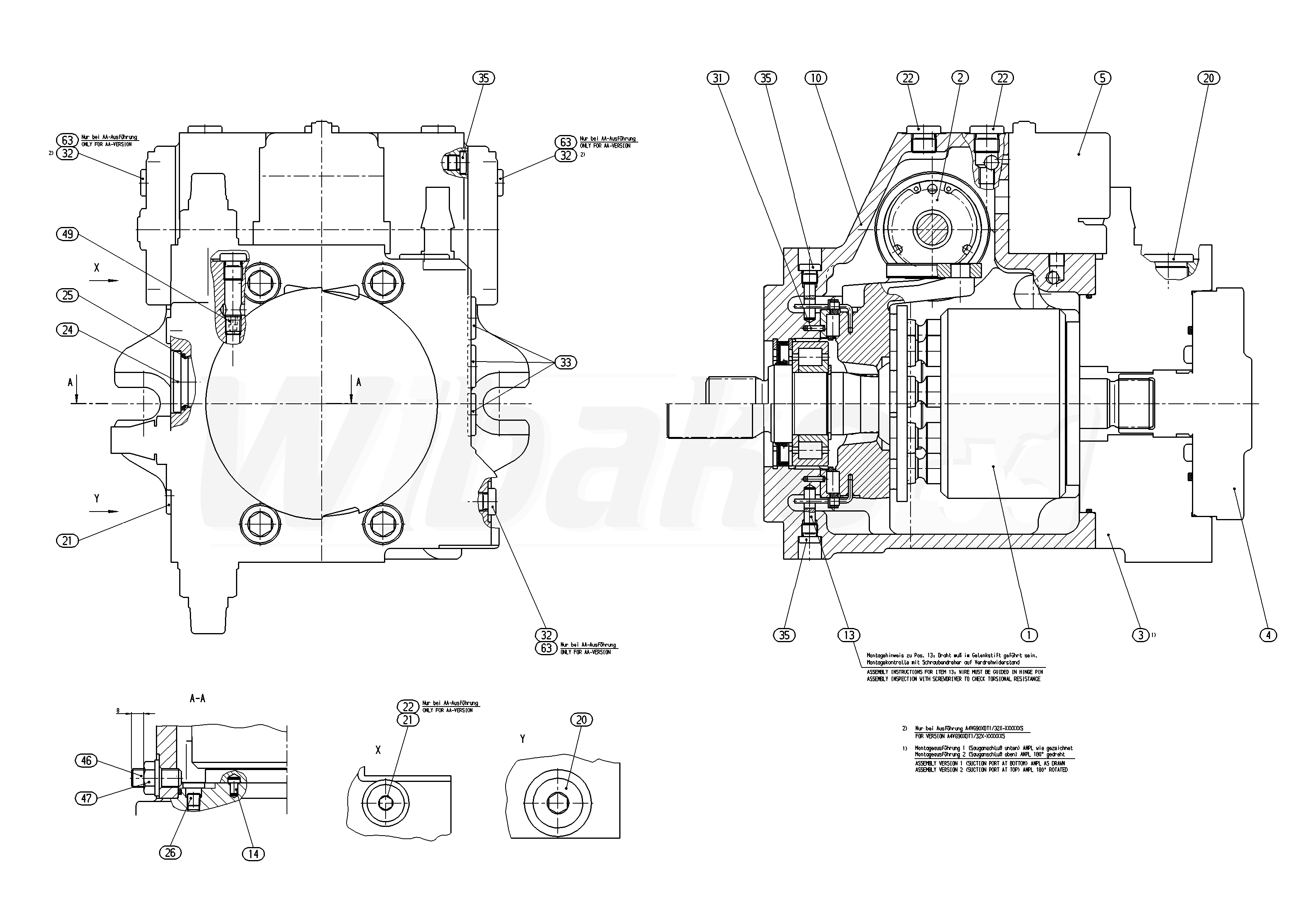 Axial piston variable pump A4VG. Geometric displacement 90 cm3. Series 3, index 2. Direction of rotation (viewed on drive shaft): clockwise. Sealing material: NBR (nitrile rubber), shaft seal in FKM (fluoroelastomer). Splined shaft ANSI B92.1a for single pump. Mounting flange SAE J744 2+4-hole. Integrated boost pump. Flange SAE J744 82-2 (A), hub for splined shaft 5/8 in 9T 16/32DP. High pressure relief valve, pilot operated 100 to 420 bar with bypass. Filtration in the boost pump suction line.