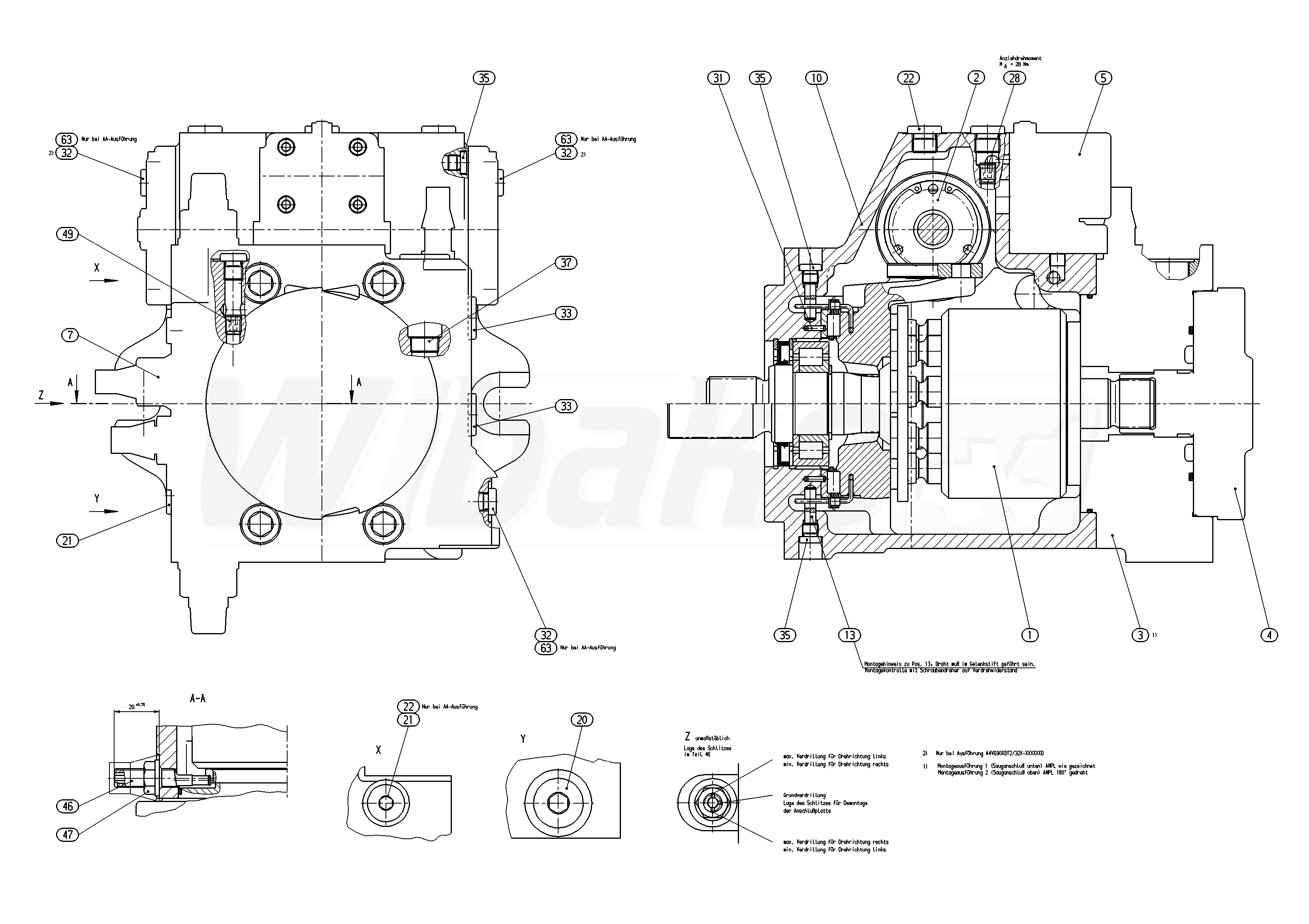 Axial piston variable pump A4VG. Geometric displacement 105 cm3. Proportional control, hydraulic, Pilot-pressure related p = 6 to 18 bar. Pressure cut-off. DA control valve, fixed setting. Series 3, index 2. Direction of rotation (viewed on drive shaft): counter-clockwise. Sealing material: NBR (nitrile rubber), shaft seal in FKM (fluoroelastomer). Splined shaft DIN 5480 for combination pump – 1st pump. Mounting flange SAE J744 2+4-hole. SAE working port A and B, top and bottom Suction port S bottom. Integrated boost pump. Flange SAE J744 101-2 (B), hub for splined shaft 7/8 in 13T 16/32DP. High pressure relief valve, pilot operated 100 to 420 bar with bypass. Filtration in the boost pump pressure line. Ports for external boost circuit filtration (Fe and Fa).