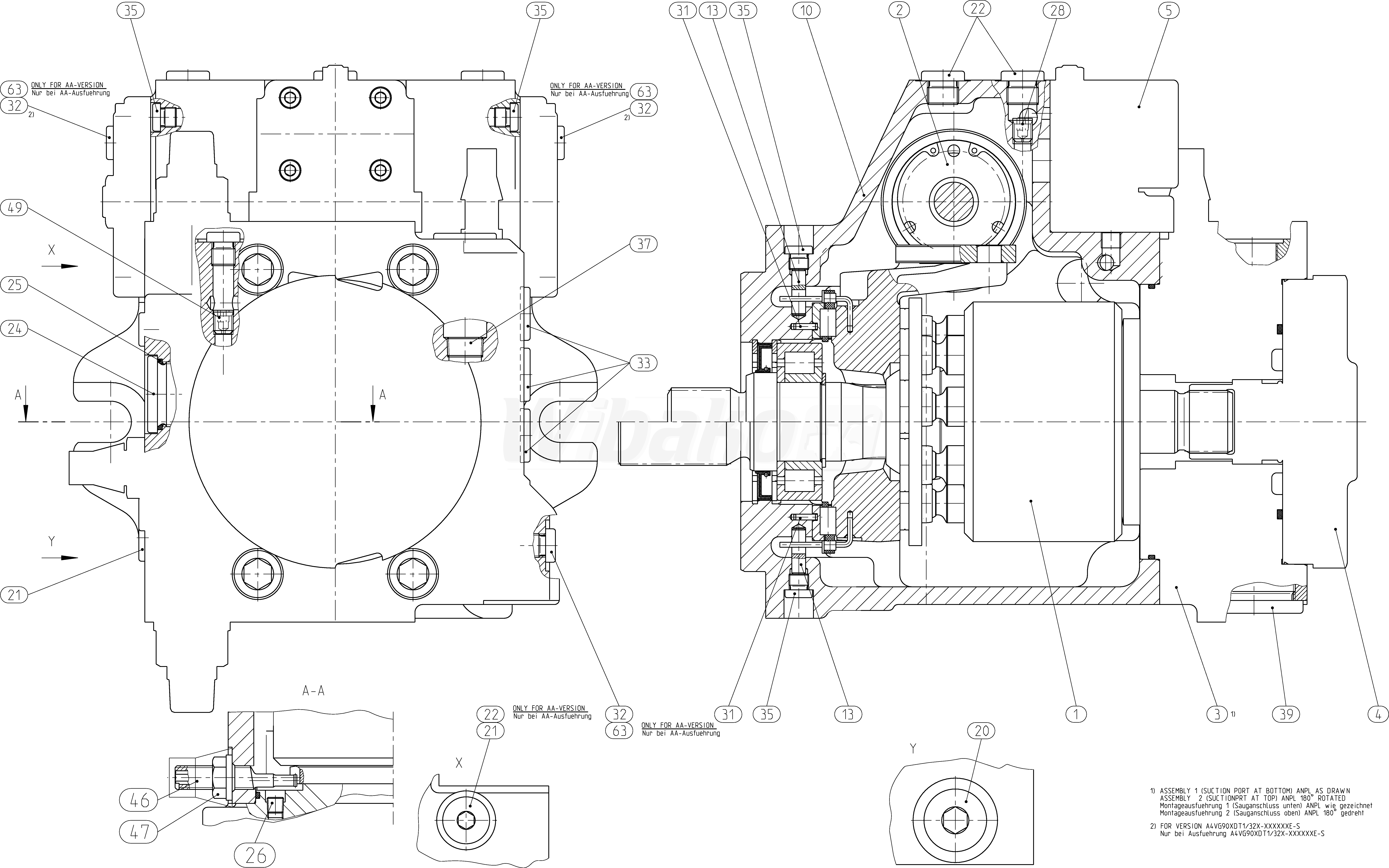Axial piston variable pump A4VG. Geometric displacement 105 cm3. Proportional control, electric U = 24 V. Pressure cut-off. Stroking chamber pressure port X3, X4. Without DA control valve. Series 3, index 2. Direction of rotation (viewed on drive shaft): counter-clockwise. Sealing material: NBR (nitrile rubber), shaft seal in FKM (fluoroelastomer). Splined shaft DIN 5480 for combination pump – 1st pump. Mounting flange SAE J744 2+4-hole. SAE working port A and B, top and bottom Suction port S bottom. Without integrated boost pump. Without through drive. High pressure relief valve, pilot operated 100 to 420 bar with bypass. External boost pressure supply.