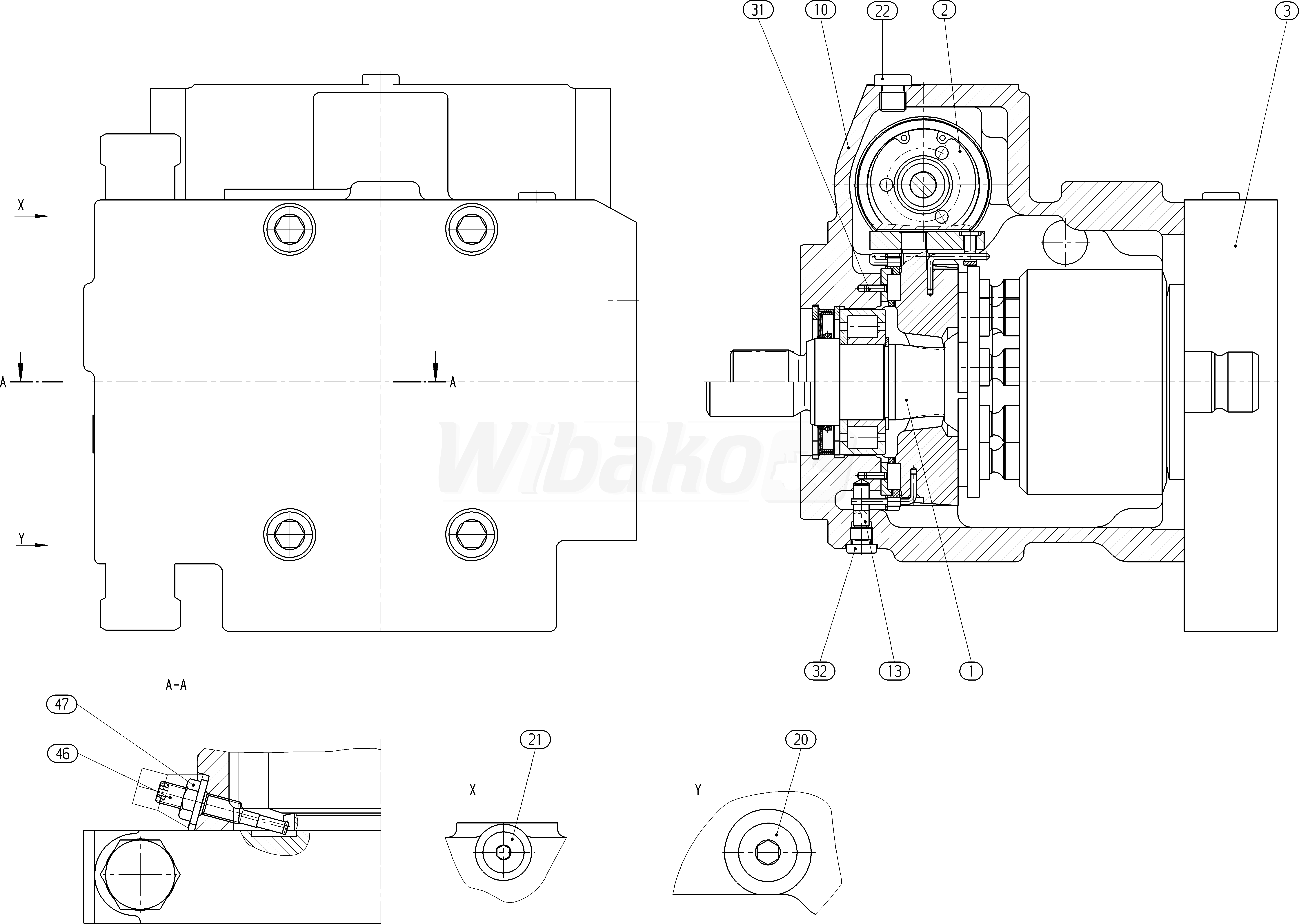 Axial piston variable pump A4VG. Geometric displacement 56 cm3. Hydraulic control, direct operated. Mechanical stroke limiter, externally adjustable. Stroking chamber pressure port X3, X4. Without DA control valve. Series 3, index 2. Direction of rotation (viewed on drive shaft): clockwise. Sealing material: NBR (nitrile rubber), shaft seal in FKM (fluoroelastomer). Splined shaft ANSI B92.1a for single pump. Mounting flange SAE J744 2-hole.