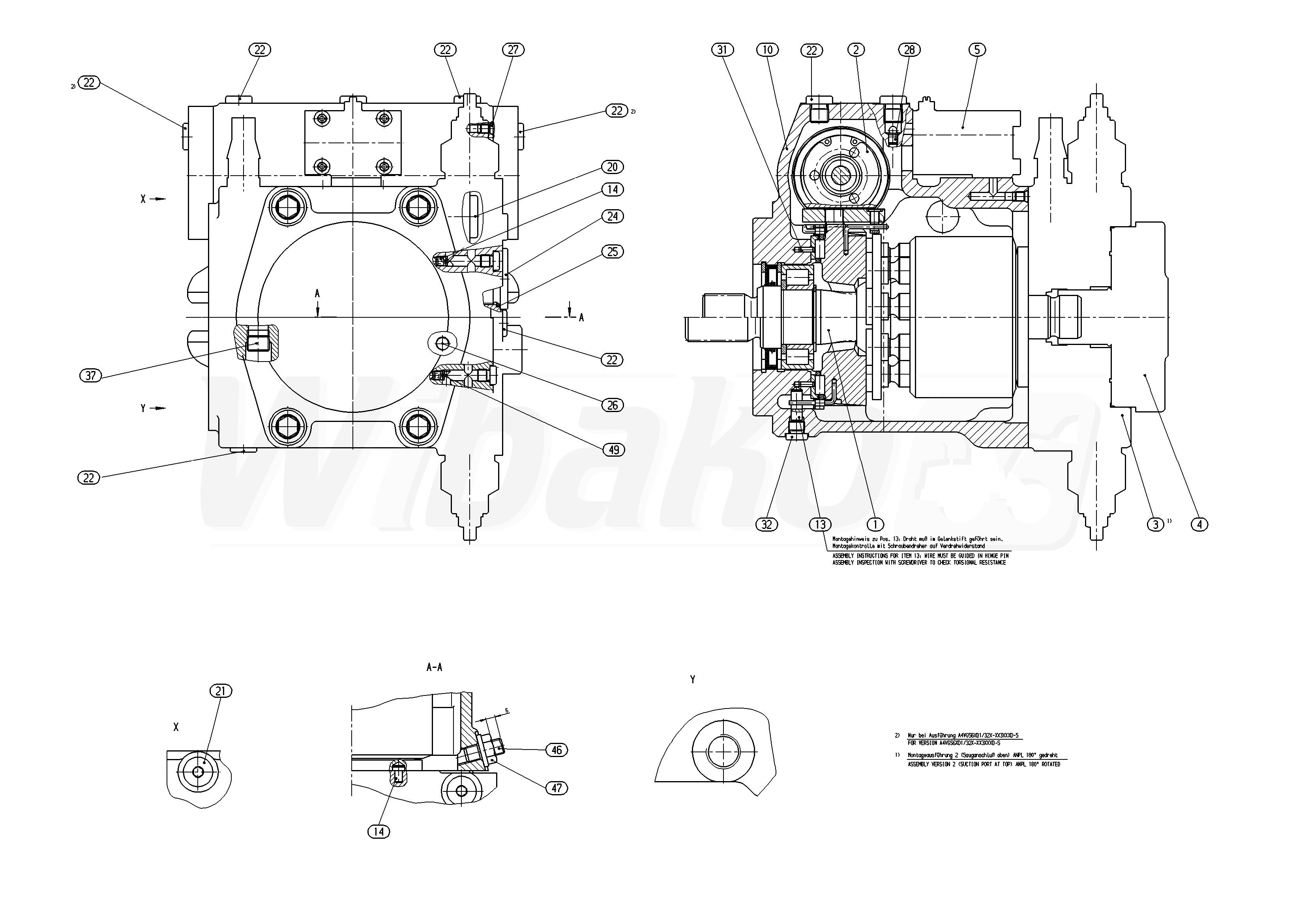 Axial piston variable pump A4VG. Geometric displacement 56 cm3. Proportional control, electric U = 12 V. Pressure cut-off. Without DA control valve. Series 3, index 2. Direction of rotation (viewed on drive shaft): clockwise. Sealing material: NBR (nitrile rubber), shaft seal in FKM (fluoroelastomer). Splined shaft ANSI B92.1a for combination pump – 1st pump. Mounting flange SAE J744 2-hole. SAE working port A and B, same side left. Suction port S top. Integrated boost pump. Flange SAE J744 127-2 (C), hub for splined shaft 1 1/4 in 14T 12/24DP. High-pressure relief valve, direct operated, fixed setting 250 to 420 bar with bypass. Filtration in the boost pump pressure line. Ports for external boost circuit filtration (Fe and Fa).