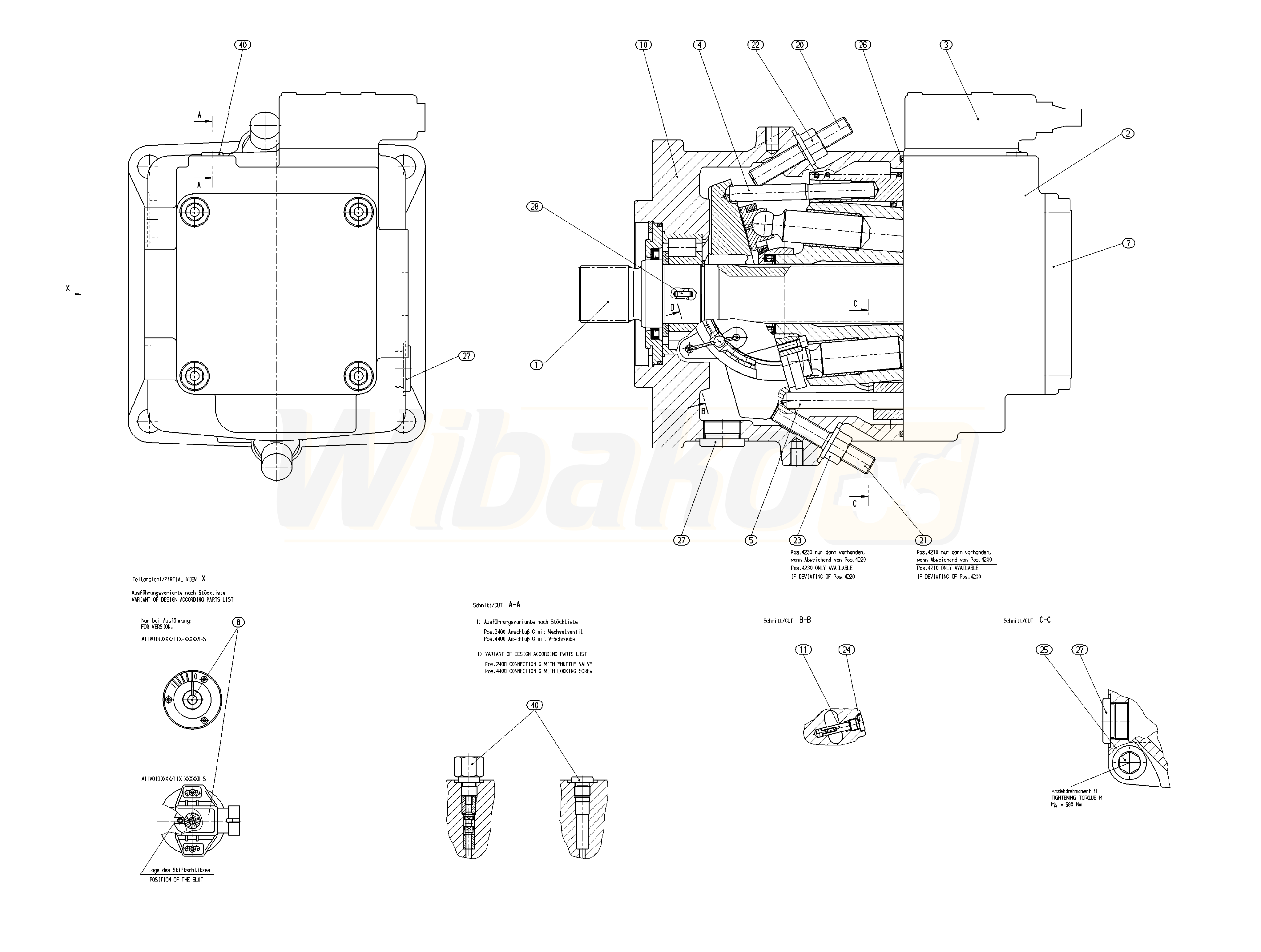 Axial Piston Variable Pump A11VO. Swashplate design, variable, nominal pressure 350 bar, maximum pressure 400 bar. Open circuit. Size, ≈ displacement Vg maks. 190 cm3. Control unit: electric control with proportional solenoid (positive characteristic) U = 24 V. Direction of rotation: counter-clockwise (viewed from shaft end). NBR (nitrile-caoutchouc), shaft seal ring in FKM (fluor-caoutchouc). Splined shaft ANSI B92.1a–1976 for single pump. Mounting flange SAE J744 – 4 hole.