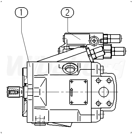Axial piston variable pump A10VO, swashplate design, open circuit, nominal pressure 250 bar, maximum pressure 315 bar. Series 52. Geometric displacement 28 cm3. Pressure controller, hydraulic. Directions of rotation: counter-clockwise (viewed on drive shaft). Splined shaft ISO 3019-1, standard. Mounting flange ISO 3019-1 (SAE) 2-hole.