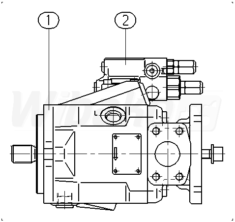 Axial piston variable pump A10VO, swashplate design, open circuit, nominal pressure 250 bar, maximum pressure 315 bar. Series 52. Geometric displacement 28 cm3. Pressure controller with pressure cut-off, hydraulic, remote controlled. Directions of rotation: clockwise (viewed on drive shaft). Splined shaft ISO 3019-1, for higher torque. Mounting flange ISO 3019-1 (SAE) 2-hole. SAE flange ports, fastening thread metric, laterally opposite, for through drive. Through drive flange ISO 3019-1 101-2 (B) , hub for splined shaft 7/8 in 13T16/32DP.