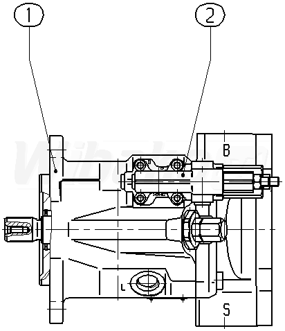 Axial piston variable pump A10VO, swashplate design, open circuit, nominal pressure 250 bar, maximum pressure 315 bar. Series 52. Geometric displacement 28 cm3. Pressure controller with pressure cut-off, hydraulic, remote controlled. Directions of rotation: clockwise (viewed on drive shaft). Seal: FKM (fluoroelastomer). Splined shaft ISO 3019-1, standard. Mounting flange ISO 3019-1 (SAE) 2-hole. SAE flange ports, fastening thread metric, laterally opposite, for through drive. Through drive flange ISO 3019-1 101-2 (B) , hub for splined shaft 7/8 in 13T16/32DP.
