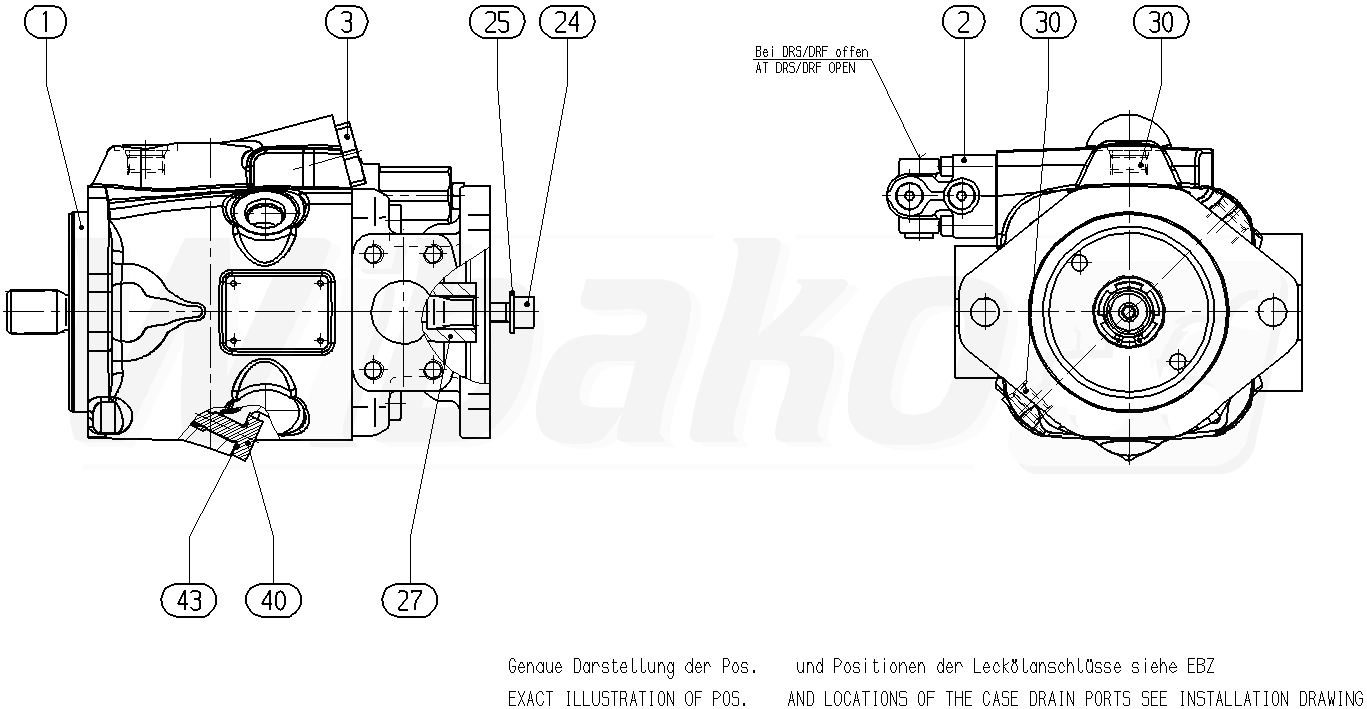 Axial piston variable pump A10VO, swashplate design, open circuit, nominal pressure 250 bar, maximum pressure 315 bar. Series 53. Geometric displacement 28 cm3. Pressure controller with flow controller, hydraulic, X-T plugged with flushing function. Seal: FKM (fluoroelastomer). Splined shaft ISO 3019-1, standard. Mounting flange ISO 3019-1 (SAE) 2-hole. SAE flange ports, fastening thread metric, laterally opposite, for through drive. Through drive flange ISO 3019-1 82-2 (A) , hub for splined shaft 5/8 in 9T16/32DP.