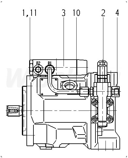 Axial piston variable pump A10V, swashplate design, open circuit, nominal pressure 280 bar, maximum pressure 350 bar. Series 31. Geometric displacement 28 cm3. Drive splined shaft ANSI B92.1a. Mounting flange ISO 3019-1 (SAE) 2-hole. SAE flange ports according to J518 Working ports UNF. Fastening thread UNF; lateral top bottom, for through drive. Without through drive.