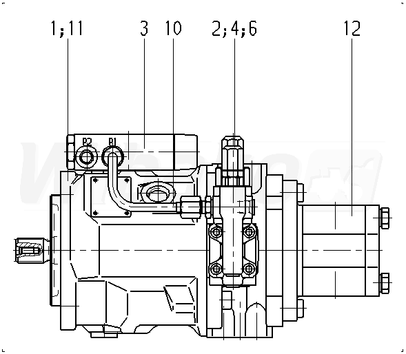 Axial piston variable pump A10V, swashplate design, open circuit, nominal pressure 280 bar, maximum pressure 350 bar. Series 31. Geometric displacement 28 cm3. Drive splined shaft ANSI B92.1a. Mounting flange ISO 3019-1 (SAE) 2-hole. SAE flange ports according to J518 Working ports UNF. Fastening thread UNF; lateral top bottom, for through drive.