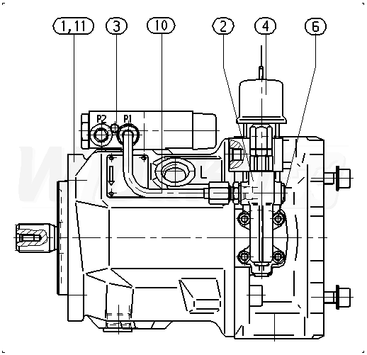 Axial piston variable pump A10V, swashplate design, open circuit, nominal pressure 280 bar, maximum pressure 350 bar. Series 31. Geometric displacement 45 cm3. Sealing material: FKM (fluoroelastomer). Drive splined shaft ANSI B92.1a. Mounting flange ISO 3019-1 (SAE) 2-hole. SAE flange ports according to J518 Working ports UNF. Fastening thread UNF; lateral top bottom, for through drive. Through drive. Flange ISO 3019-1 82-2 (A). Hub for splined shaft 5/8 in 9T 16/32DP.