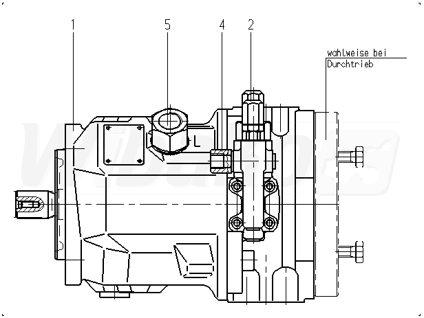 Axial piston variable pump A10V, swashplate design, open circuit, nominal pressure 280 bar, maximum pressure 350 bar. Series 31. Geometric displacement 45 cm3. Pressure controller with pressure cut-of, hydraulic, remote controlledDrive splined shaft ANSI B92.1a. Mounting flange ISO 3019-1 (SAE) 2-hole. SAE flange ports according to J518. Working ports metric. Fastening thread metric; lateral top bottom for through drive. Through drive. Flange ISO 3019-1 82-2 (A). Hub for splined shaft 5/8 in 9T 16/32DP.